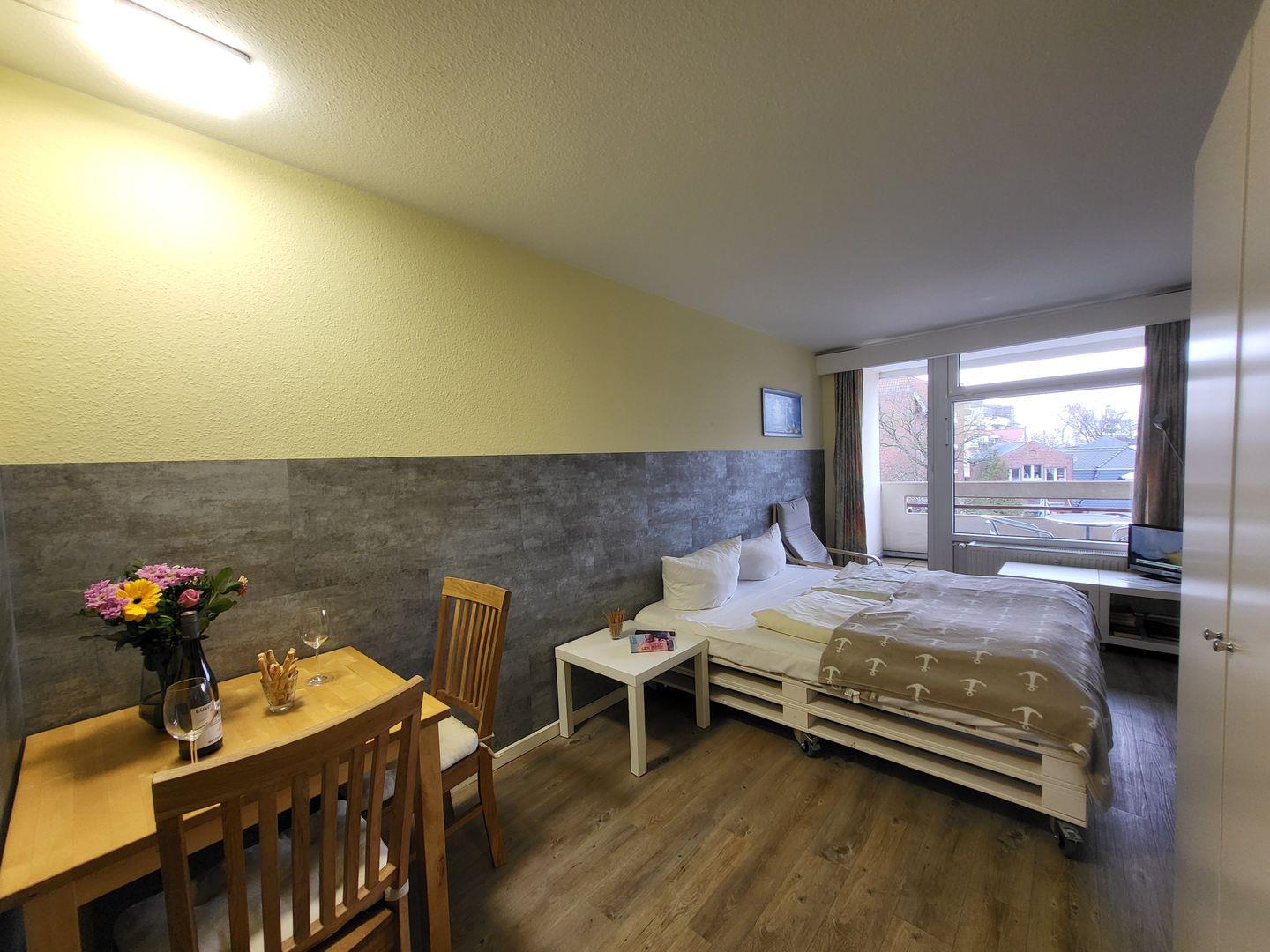 Zentrale 1-Zimmer Ferienwohnung mit Balkon zur Seeseite,160x200cm Doppelbett mit 2 Einzelmatratzen, Kochnische, Duschbad mit WC, SAT-TV.