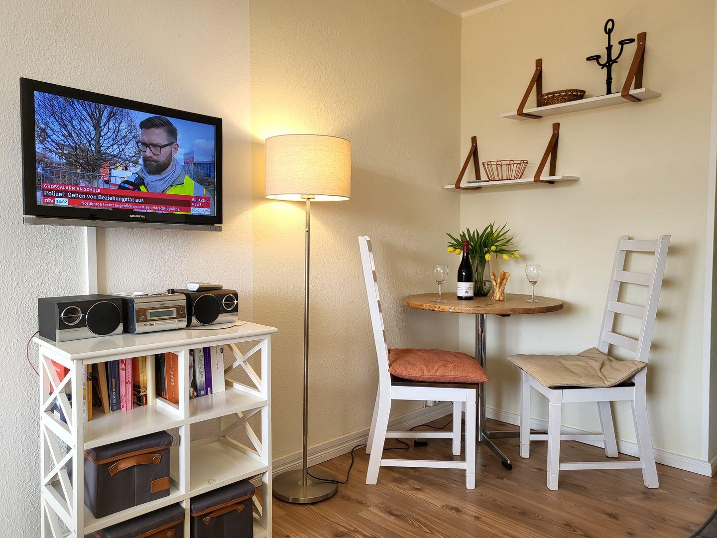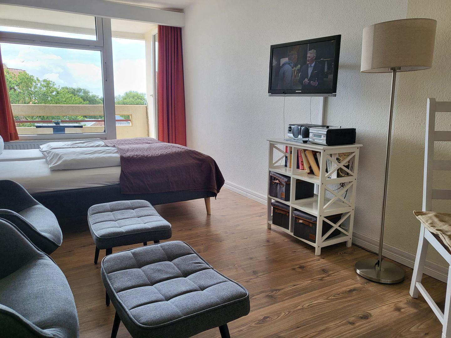 Zentral gelegene 1 Zimmer Ferienwohnung im 2. OG für 2 Personen. Möblierter Balkon mit Blick zur Seeseite. Kombinierter Wohn-Schlafraum mit Doppelbett, 2 Sessel und TV, Esstisch mit Küchenzeile sowie Duschbad mit WC.
