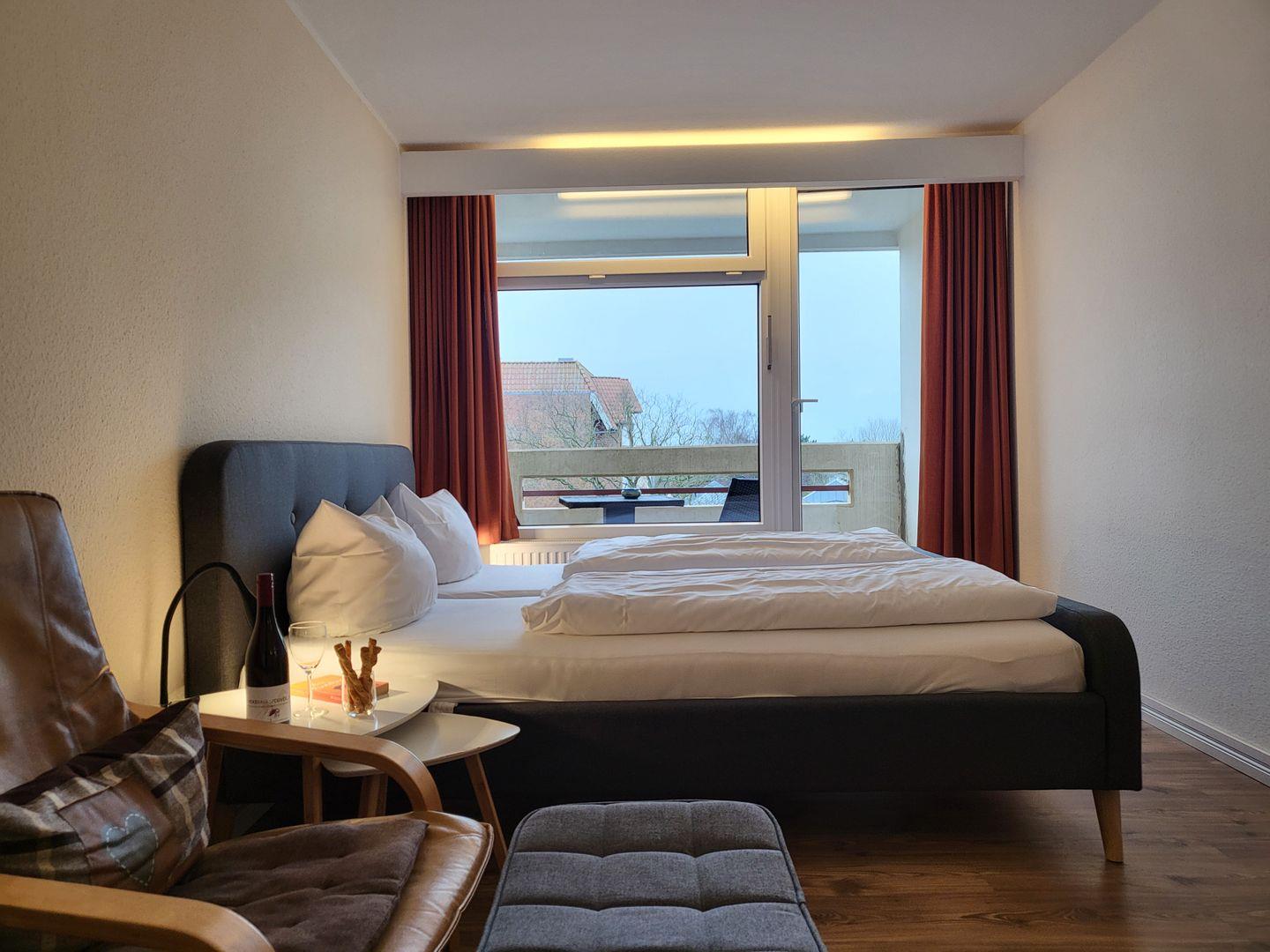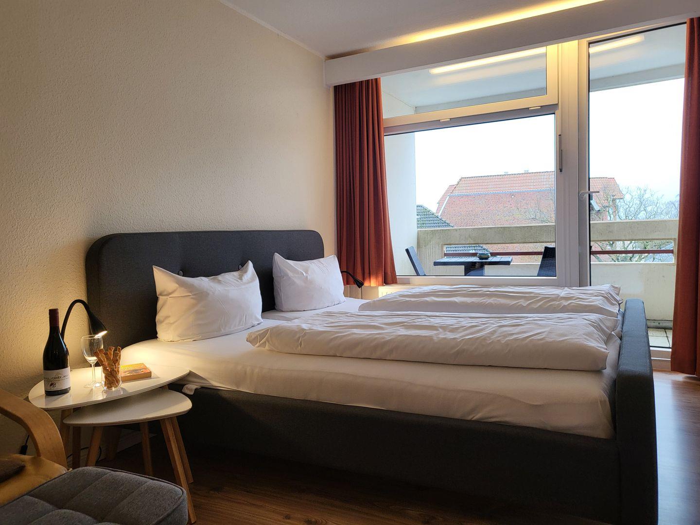 Die 25m² große, wunderbar hell und einladend wirkende 1-Zimmer Ferienwohnung liegt in der 2. Etage und bietet 2 Personen Platz für einen wunderbaren Urlaub in St. Peter Ording. Der Wohn- und Schlafraum ist ausgestattet mit einem komfortablen 180x200cm Doppelbett, zwei gemütlichen Sesseln und einem Flachbild-TV. Ein kompakter Essbereich gehört ebenfalls zur Ferienwohnung in St. Peter Ording. Dank des Durchganges zum möblierten Balkon und der Fensterfront, wirkt der Raum wunderbar hell und sympathisch. Der Balkon ist zur Seeseite ausgerichtet und bietet einen tollen Blick auf die lebendige Flaniermeile. Die Pantryküche ist gut ausgestattet und verfügt unter anderem über ein Kochfeld, Mikrowelle sowie Toaster und Kaffeemaschine. Zur Ferienwohnung gehört ein Duschbad mit WC. Diese Wohnung kann den Fahrstuhl nutzen.