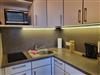 Die angrenzende, halboffene Küche ist kompakt und praktisch gehalten, bietet jedoch alles, was für kleine Mahlzeiten im Urlaub gebraucht wird.