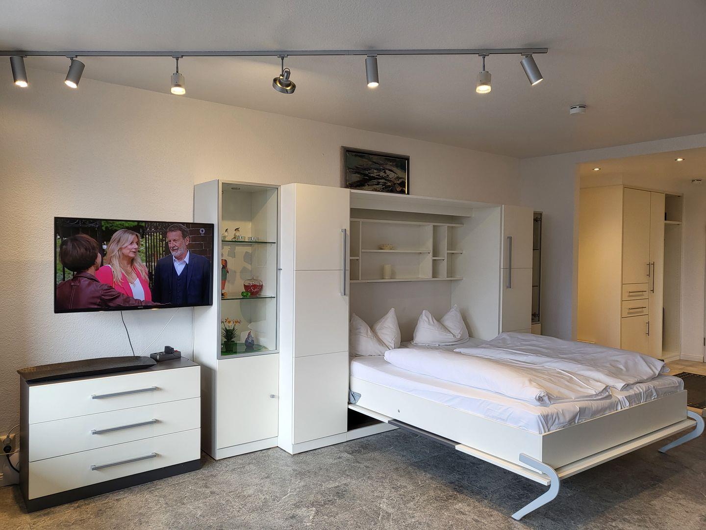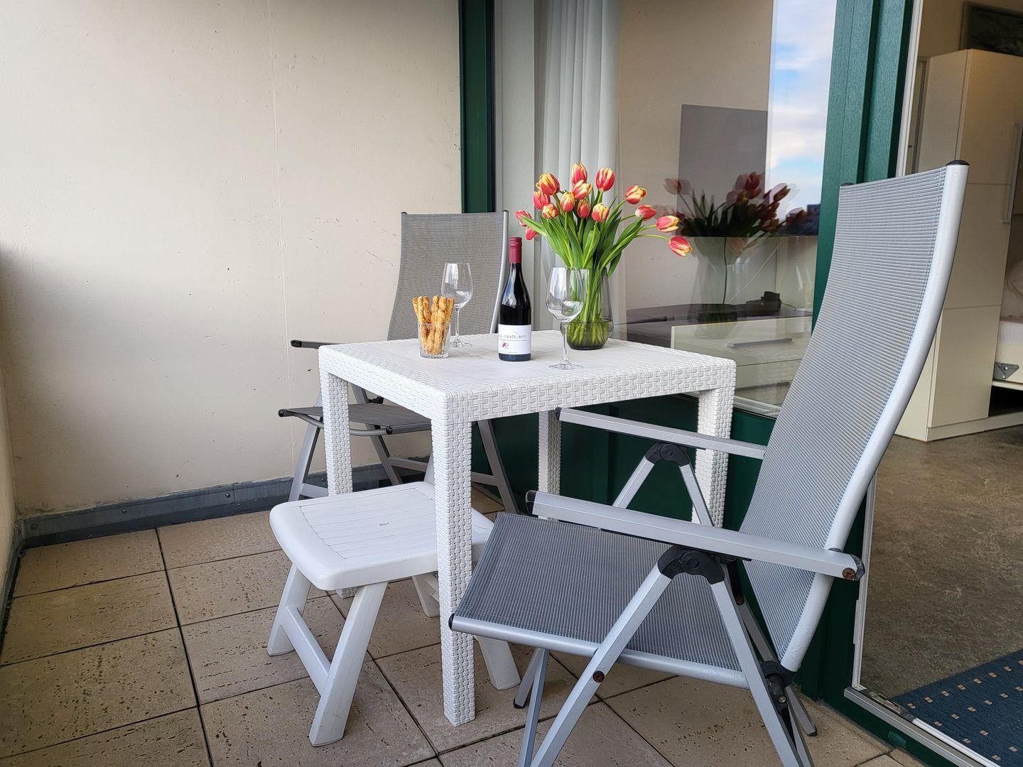 Zentrale, allergikerfreundliche 1 Zimmer Ferienwohnung im 2. OG für bis zu 2 Personen. Möblierter Balkon mit teilweisem Seeblick.