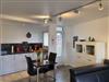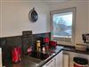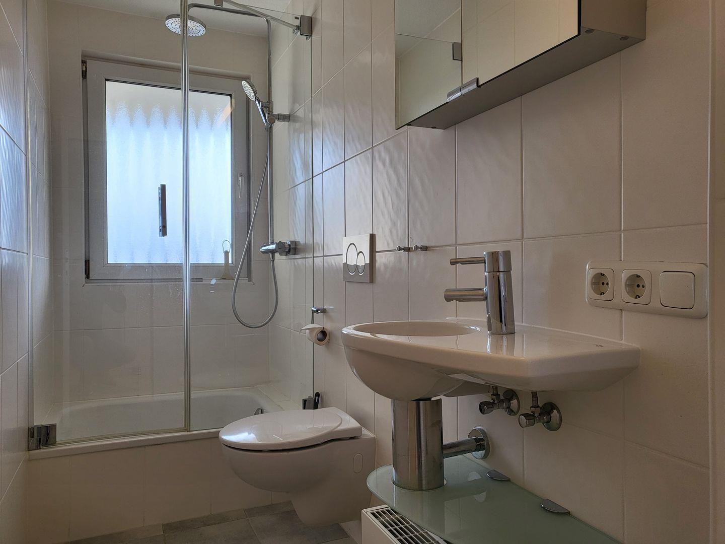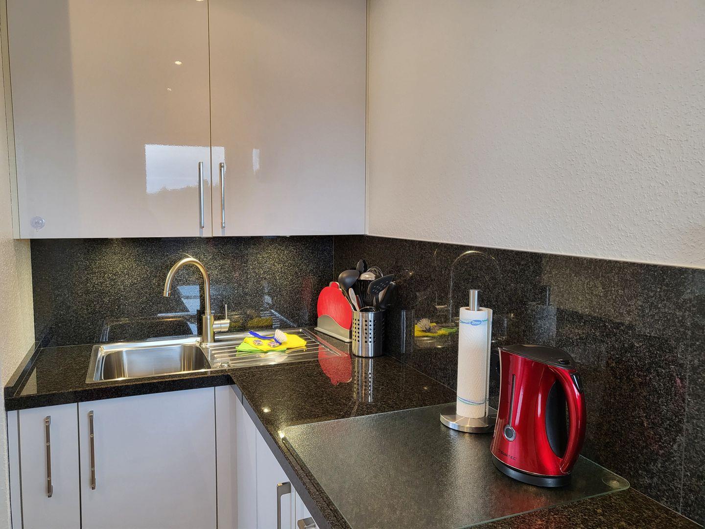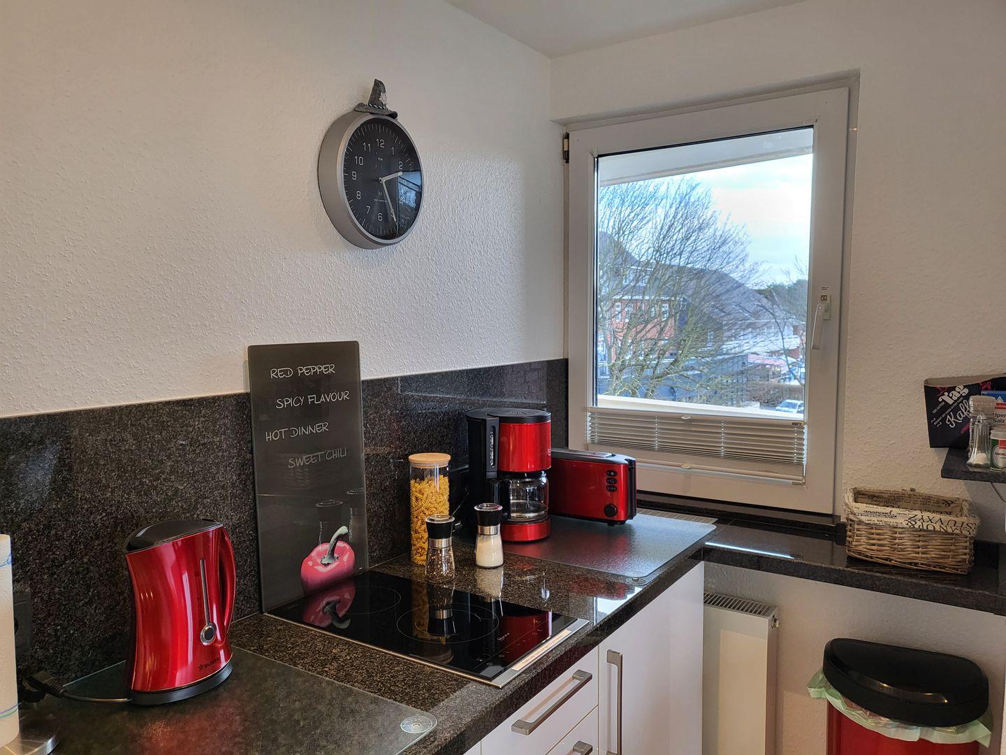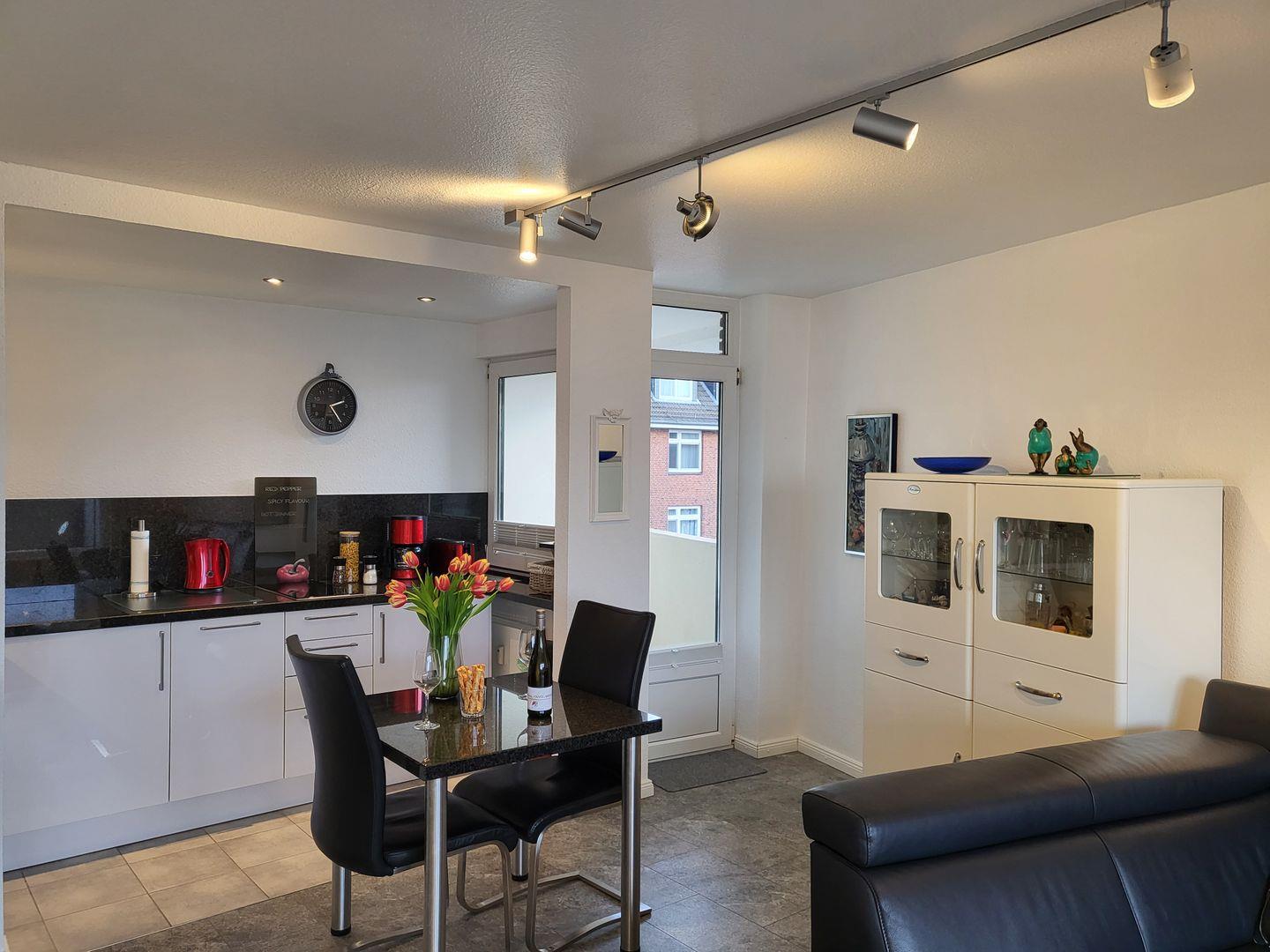 Die angrenzende Küche ist hochwertig und vollumfassend ausgestattet. Neben einem Cerankochfeld stehen unter anderem Kühlschrank, Toaster und Kaffeemaschine bereit. Die Ferienwohnung verfügt über ein tageslichterhelltes Duschbad mit WC. Zur Verfügung steht hier eine edle Regendusche. Diese Wohnung kann den Fahrstuhl nutzen.