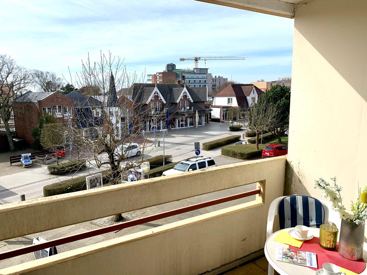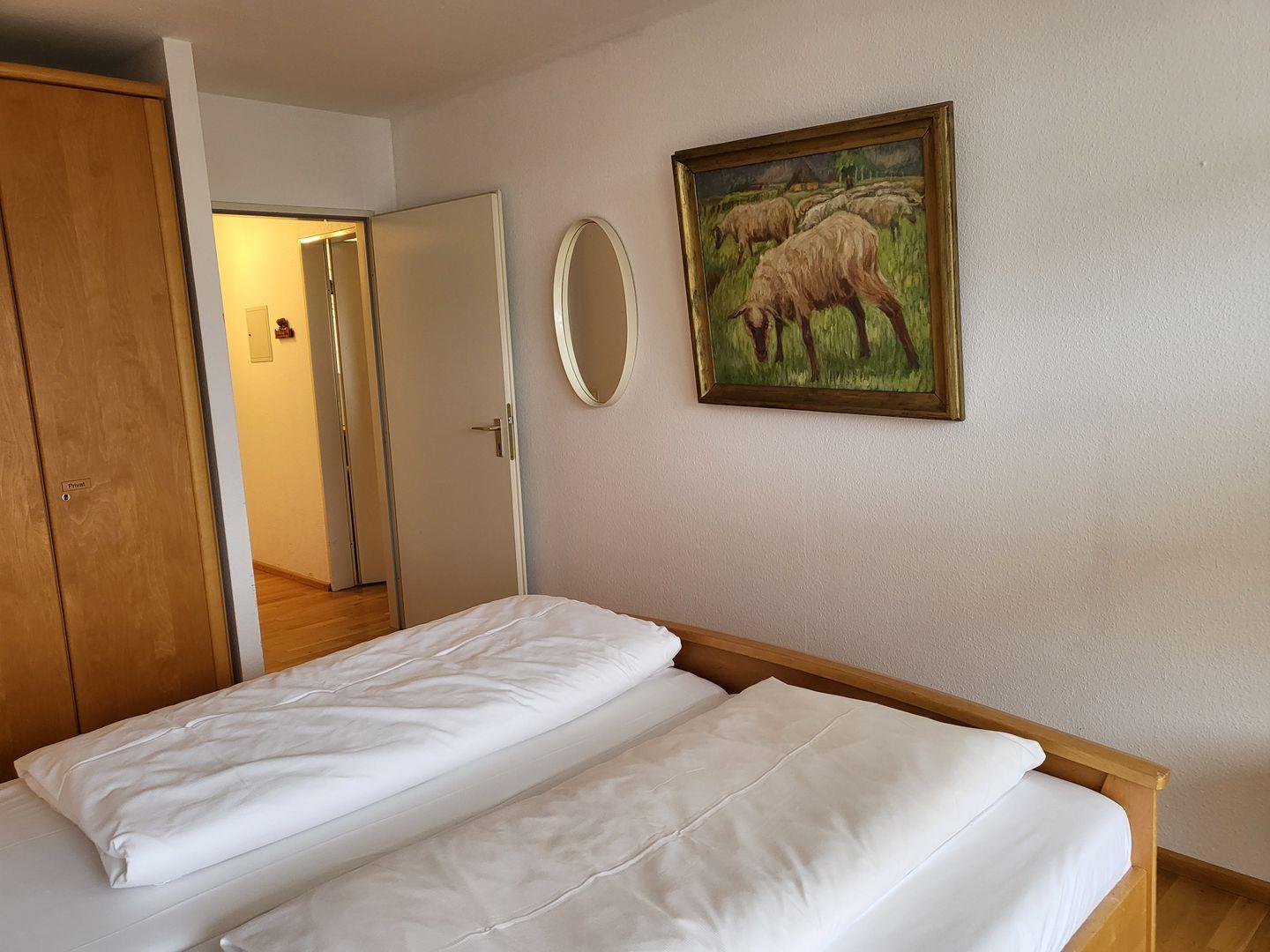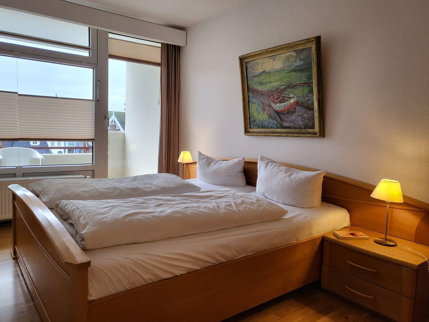 Zentrale 2-Zimmer Ferienwohnung mit Balkon. Ausgestattet mit Wohnschlafraum mit Schrankbetten und integrierter Küchenzeile, Tresen als Trennung zum Wohnraum sowie separatem Schlafzimmer mit Doppelbett.