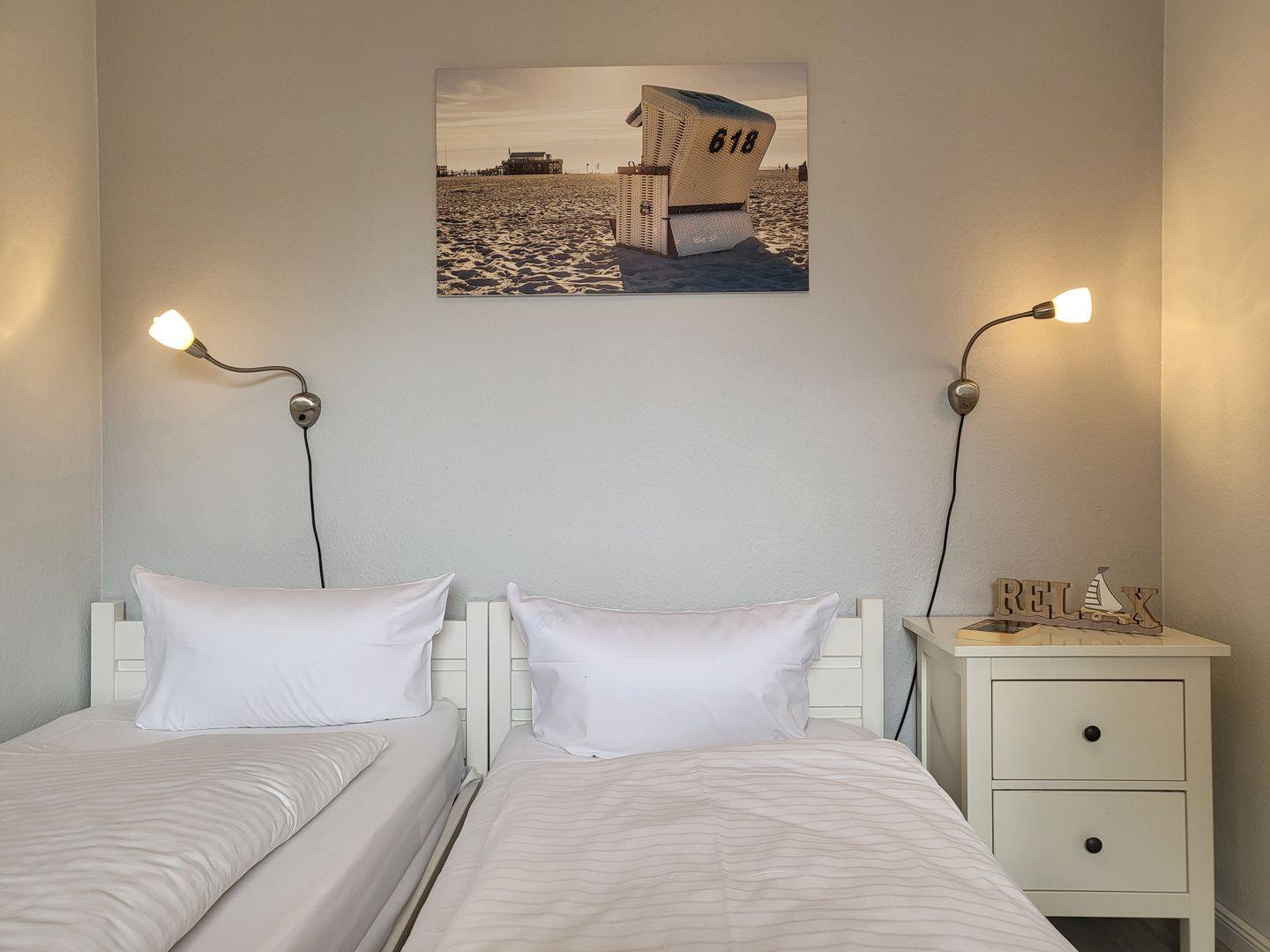 Ein separates Schlafzimmer mit zwei Einzelbetten und großem Kleiderschrank ist vorhanden. Die Ferienwohnung verfügt über ein Duschbad und WC.