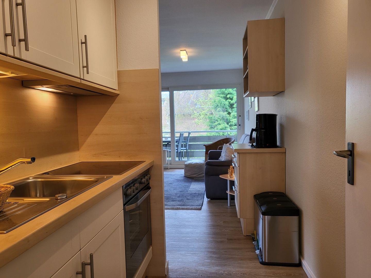 Zentrale 2 Zimmer-Wohnung für bis zu 4 Personen im 1. OG mit möbliertem Balkon. 1 Schlafzimmer mit 2 Einzelbetten, Flur mit