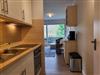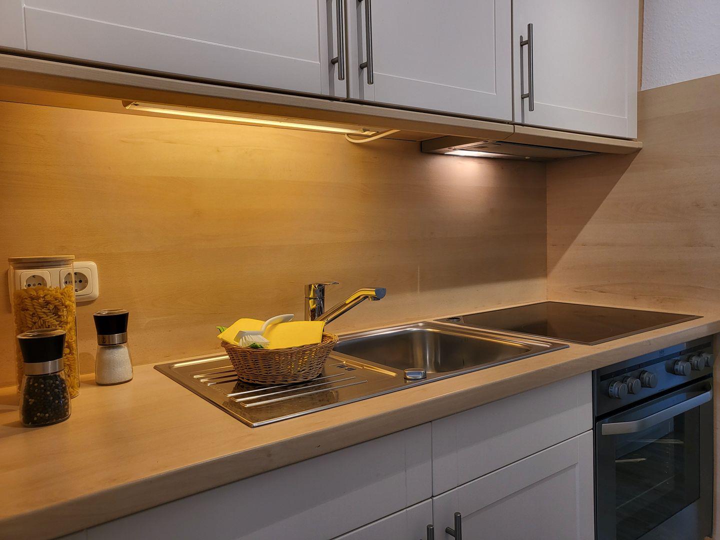 Eine gemütliche Ess-Ecke grenzt an die offene Küchenzeile an, die sehr gut ausgestattet ist. Hier stehen unter anderem Kochfeld, Kühlschrank mit Gefrierfach sowie Kaffeemaschine zur Verfügung.