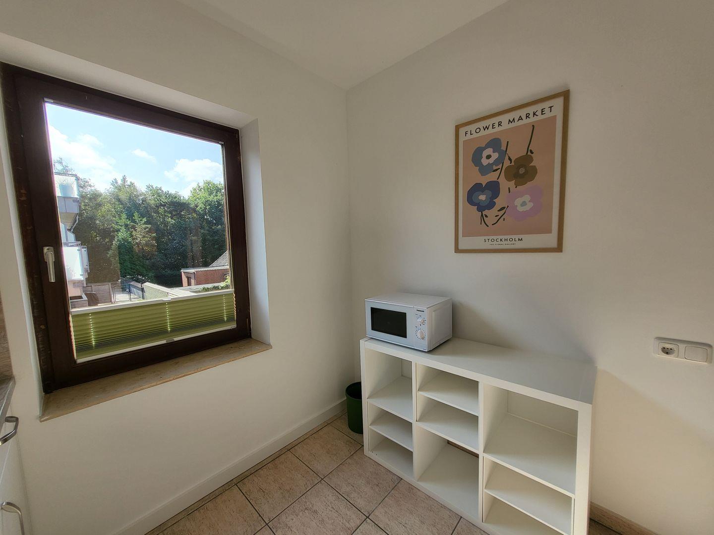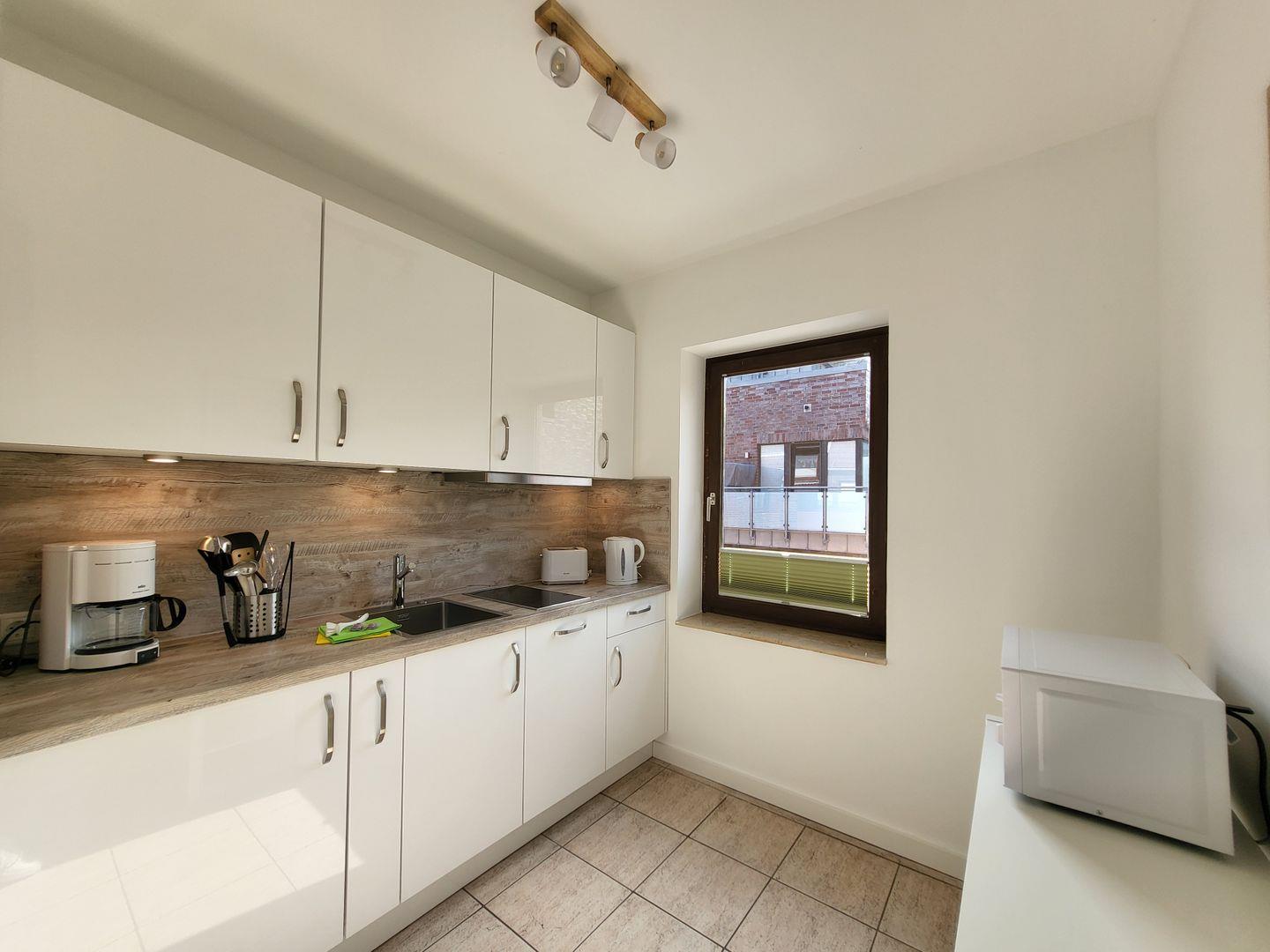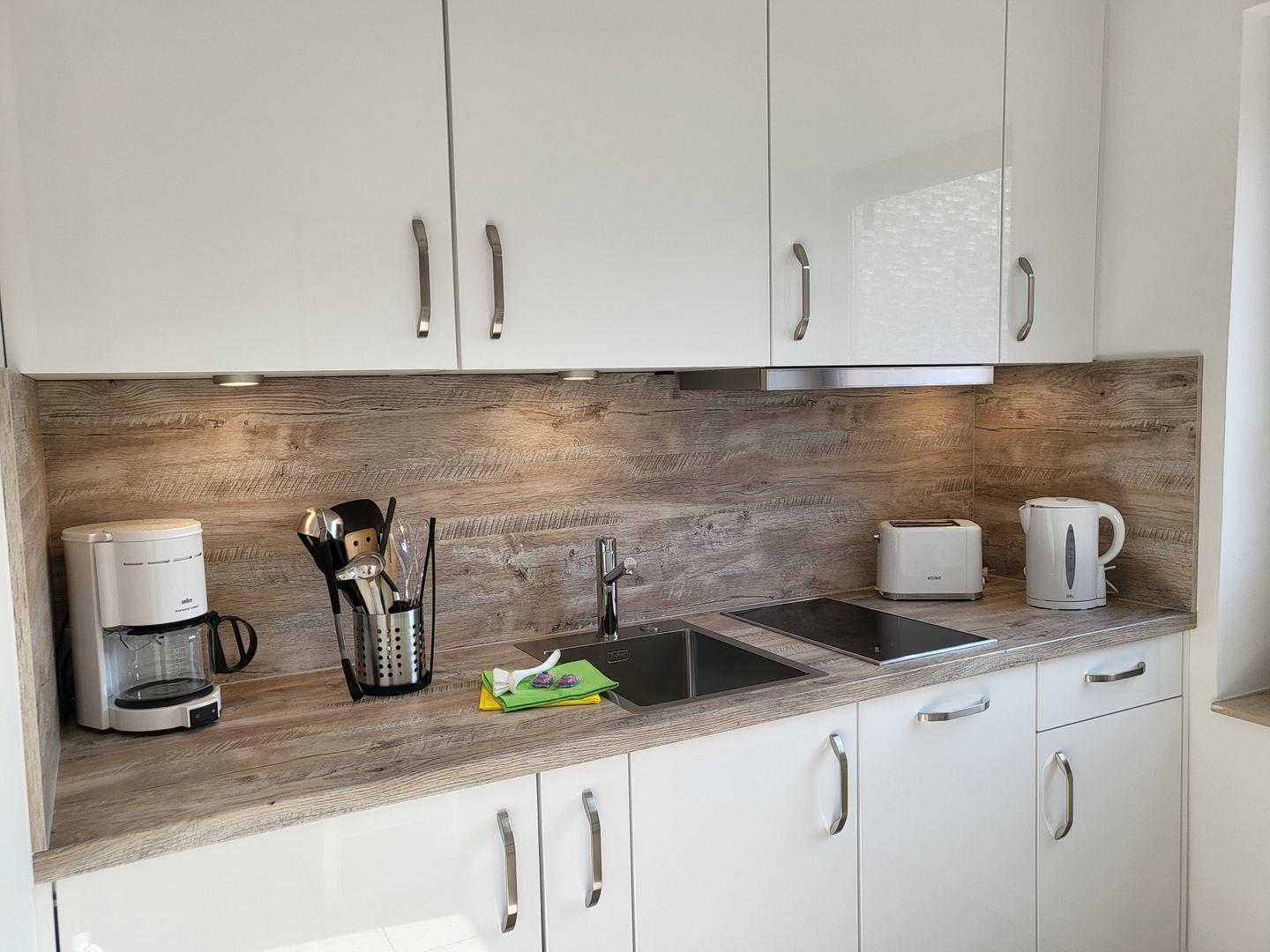 Die angrenzende, halboffene, moderne und hochwertig eingerichtete Küche verfügt unter anderem ein Cerankochfeld, Kühlschrank mit Gefrierfach sowie Kaffeemaschine, Wasserkocher und Mikrowelle.