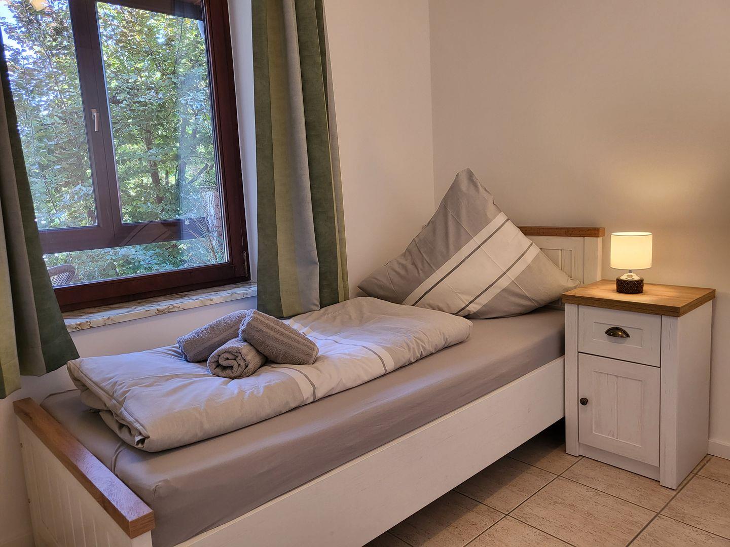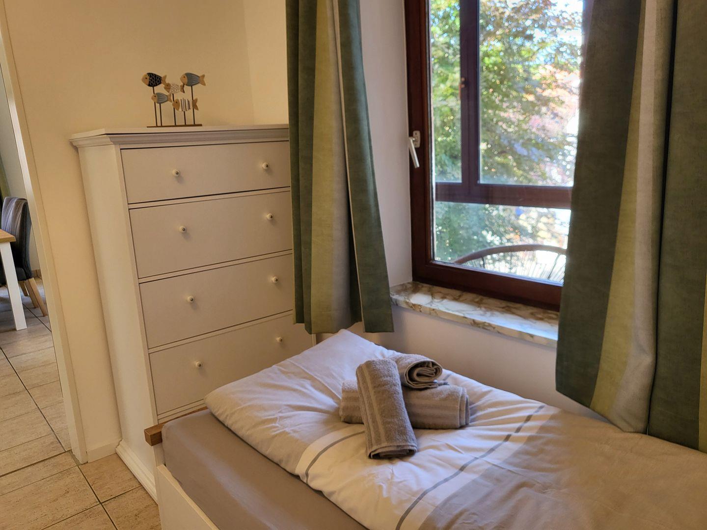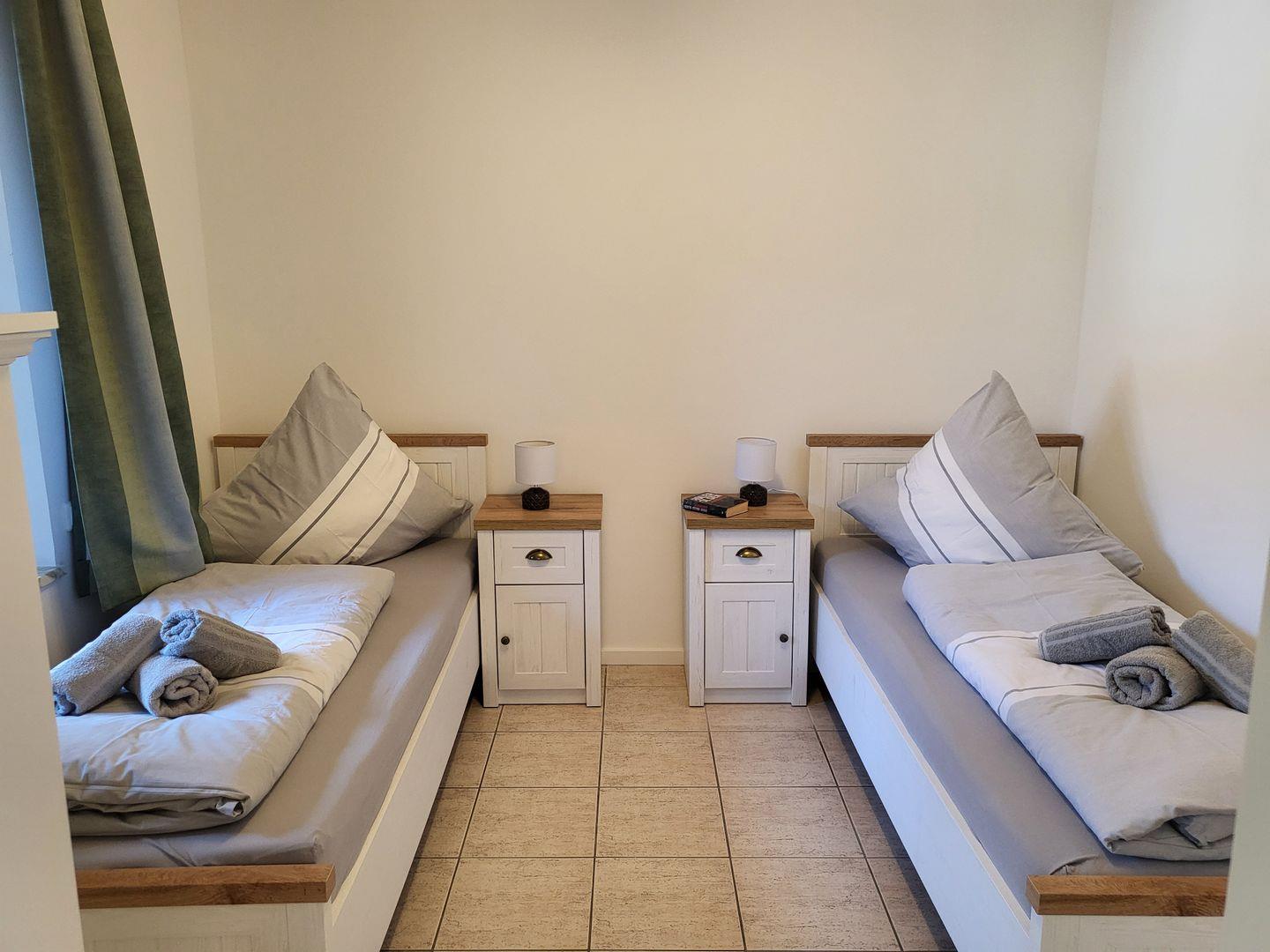 Im separaten Schlafzimmer stehen 2 Einzelbetten zur Verfügung, zur Ferienwohnung gehört ausserdem noch ein Duschbad mit WC.