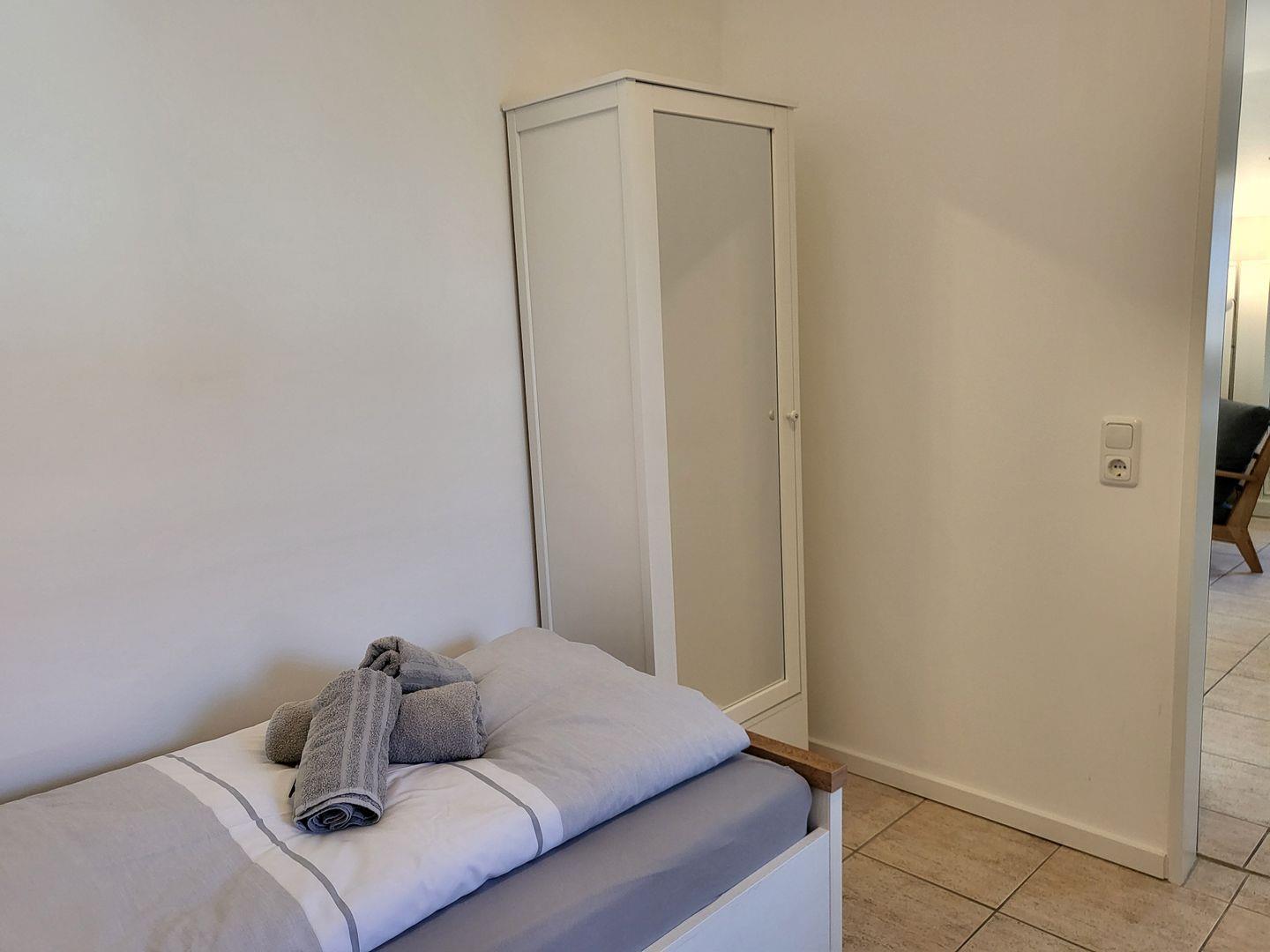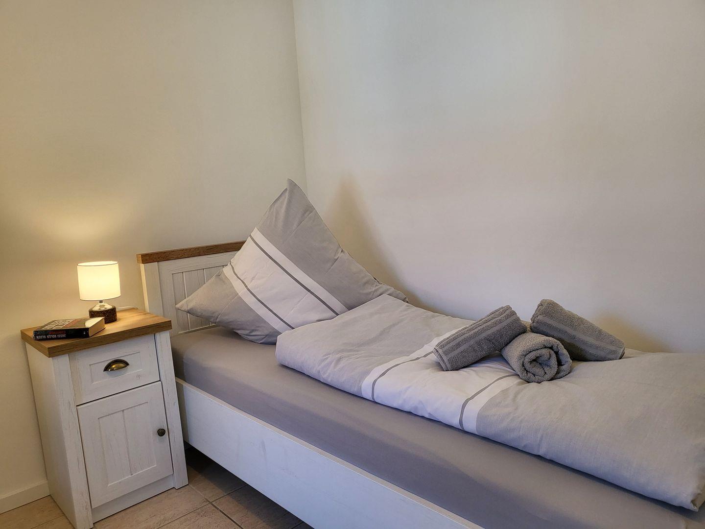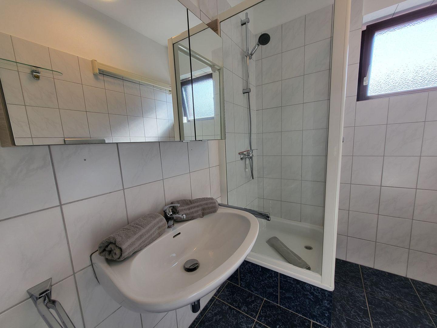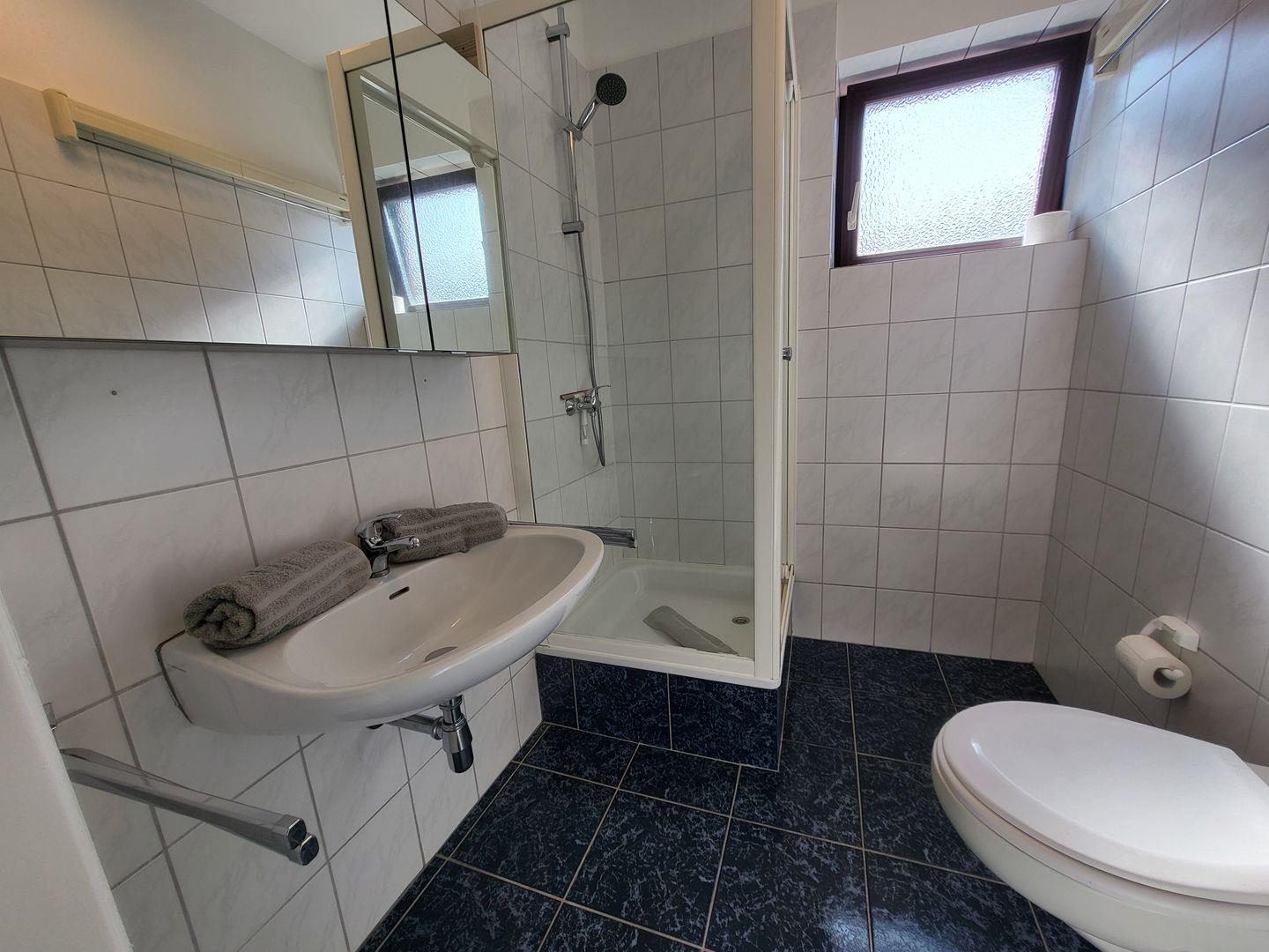 Im separaten Schlafzimmer stehen 2 Einzelbetten zur Verfügung, zur Ferienwohnung gehört ausserdem noch ein Duschbad mit WC.