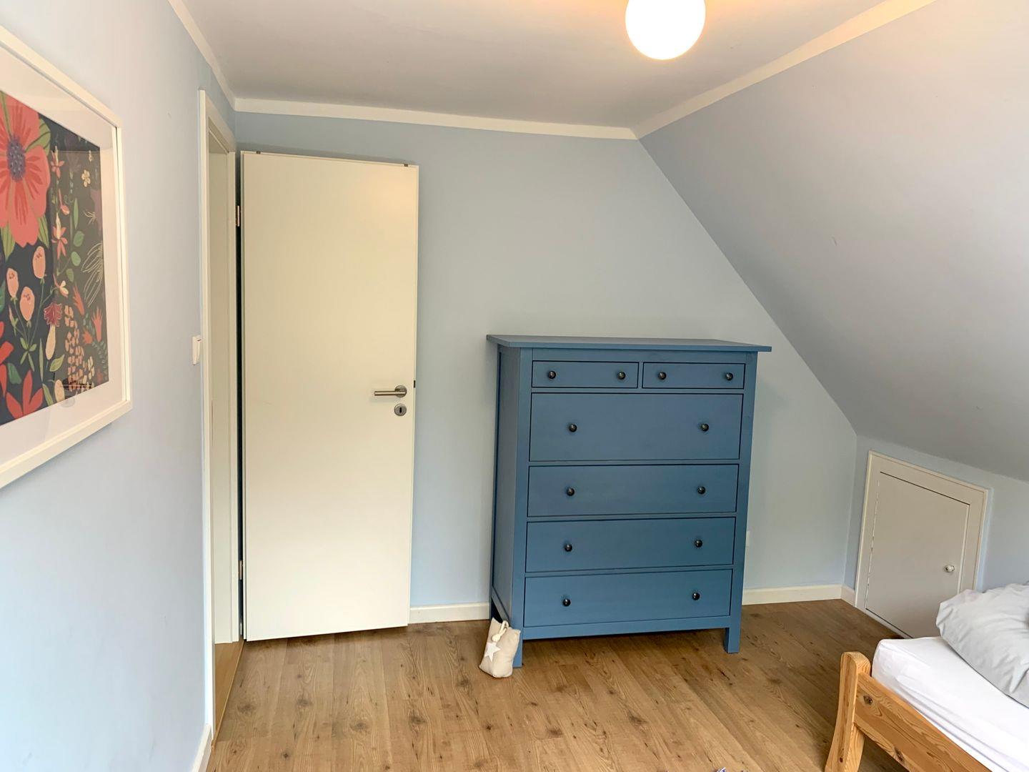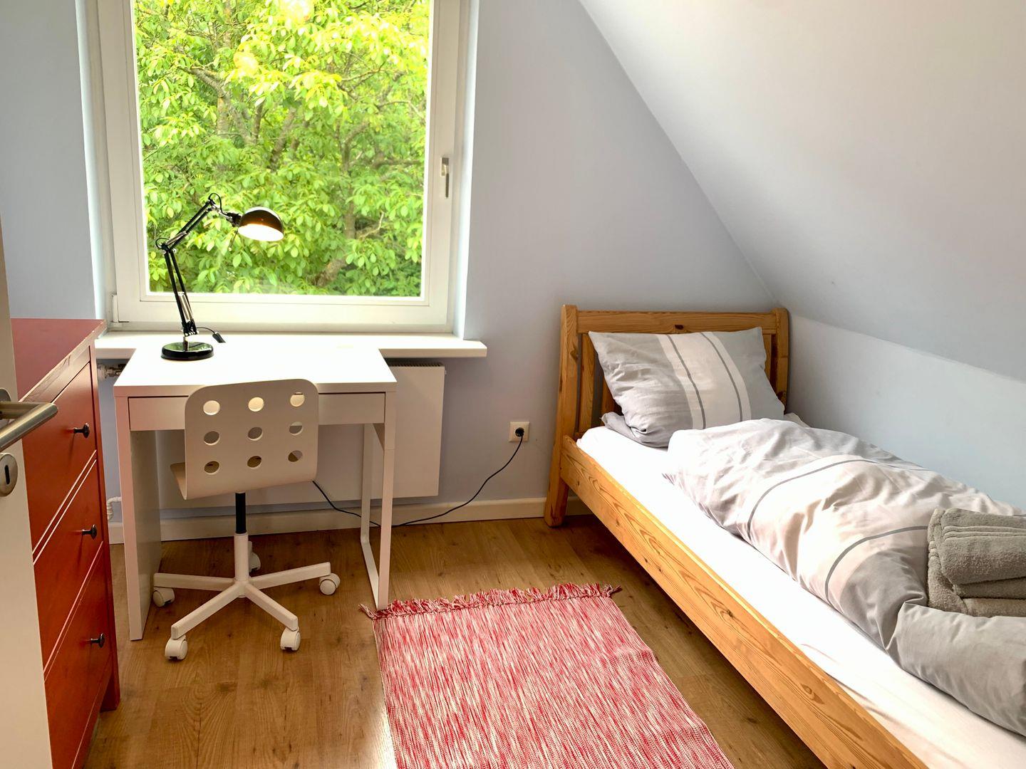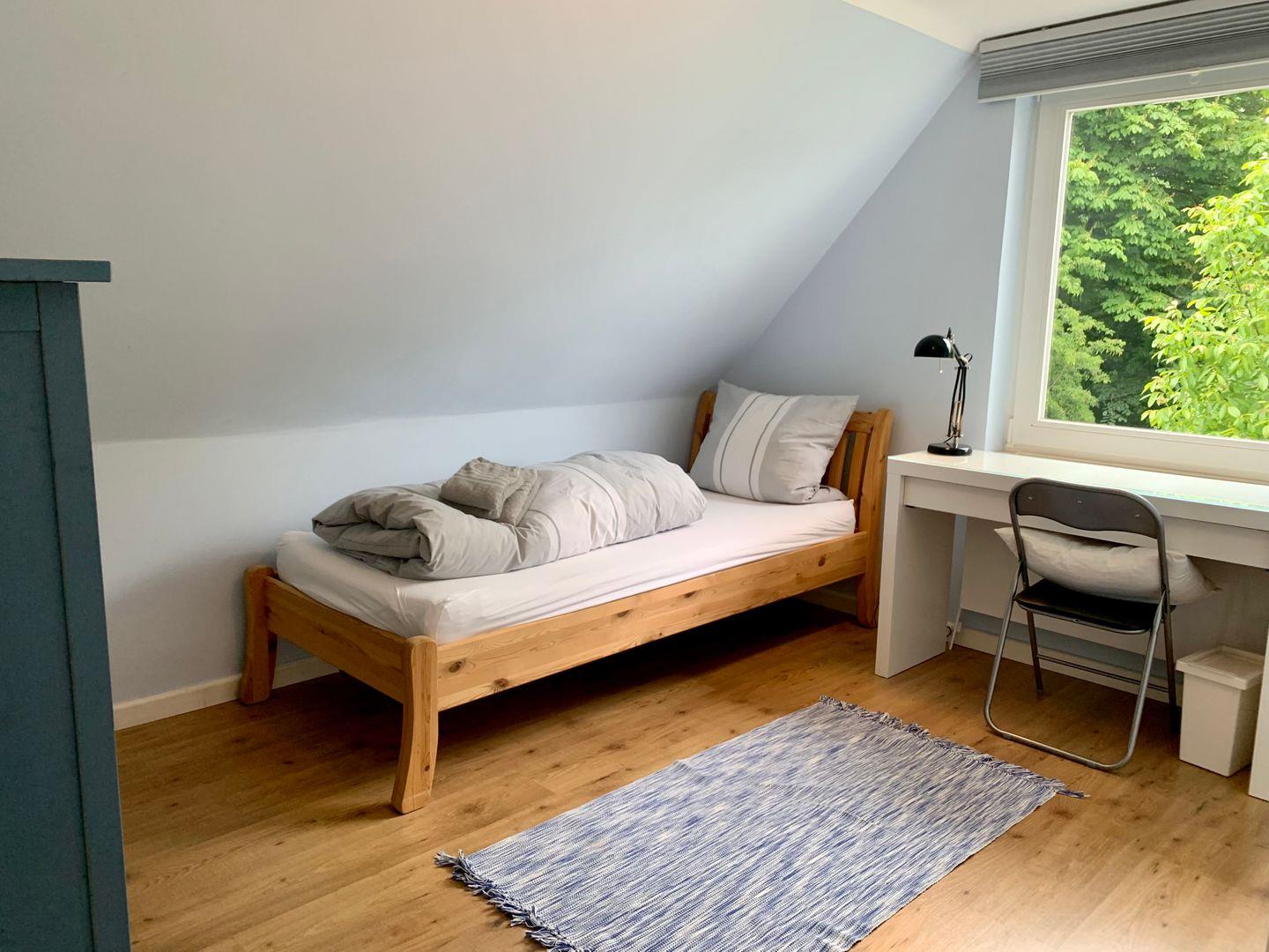 Die weiteren Schlafzimmer sind mit je einem 90x200 Einzelbett, einer Kommode und einem Schreibtisch ausgestattet. Ein separates WC gehört ebenfalls zum Obergeschoss.