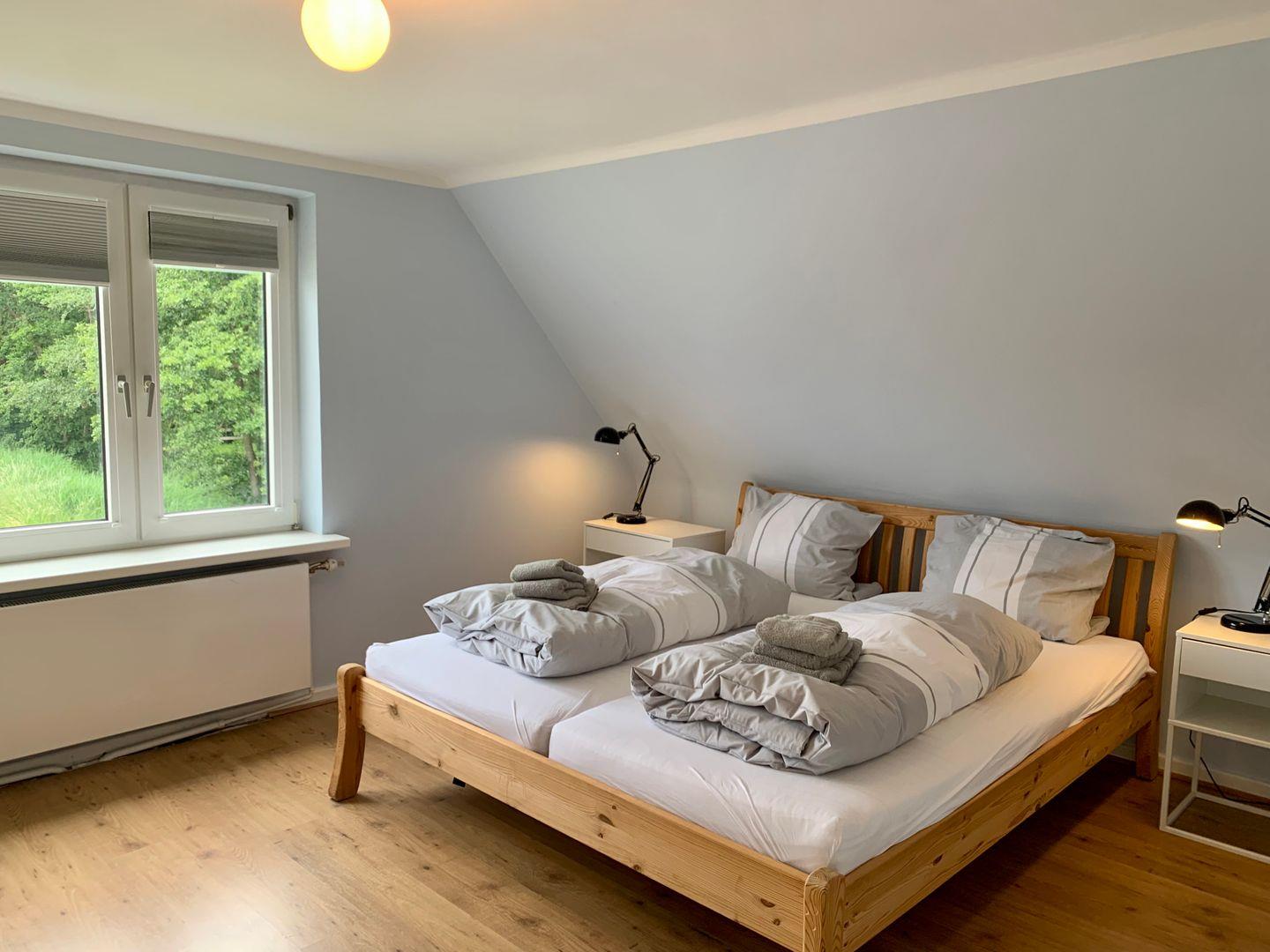 Der helle, kombinierte Wohn- und Essbereich ist ausgestattet mit einer gemütlichen Couch sowie einem Korbsessel. Für die multimediale Unterhaltung sorgen Flachbild-TV und kostenfreies W-LAN. Der Essbereich mit vier komfortablen Sitzplätzen grenzt an den Wohnbereich an. Die separate Küche ist modern und gut ausgestattet, sie verfügt unter anderem über Cerankochfeld, Kühlschrank, sowie Geschirrspüler und Kaffeemaschine. Im separaten Hauswirtschaftsraum steht ein Waschtrockner zur kostenfreien Nutzung bereit, ein Wäscheständer ist vorhanden. Ebenfalls im Erdgeschoss gelegen ist das große Badezimmer, dieses ist mit WC und bodengleicher Dusche ausgestattet. Im Obergeschoss sind drei komfortable Schlafzimmer eingerichtet. Das Elternschlafzimmer verfügt über ein großes 180x200cm Doppelbett sowie eine Kommode und einen Korbsessel.