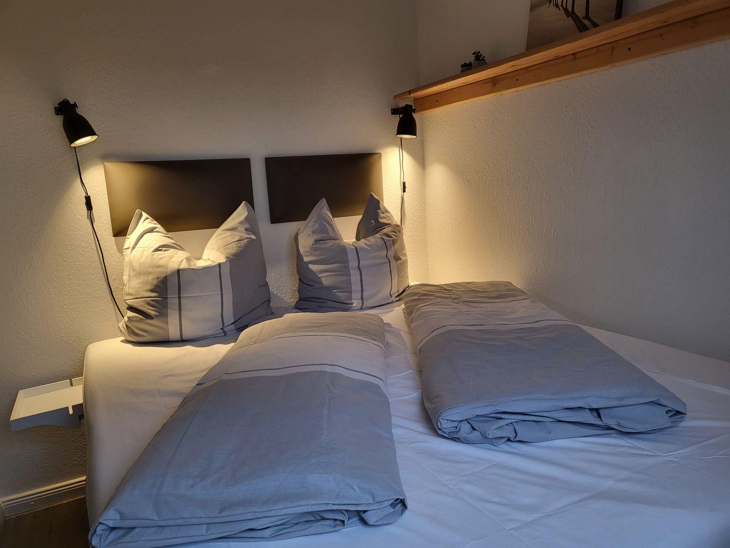 Schlafzimmer: Ein Schlafzimmer mit Schiebetür zum Wohnraum mit einem zwei mal 80 mal 200 cm Doppelbett.