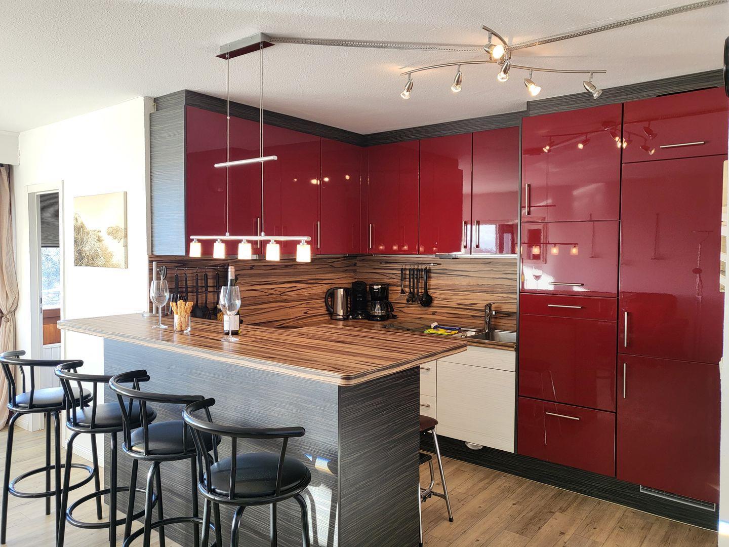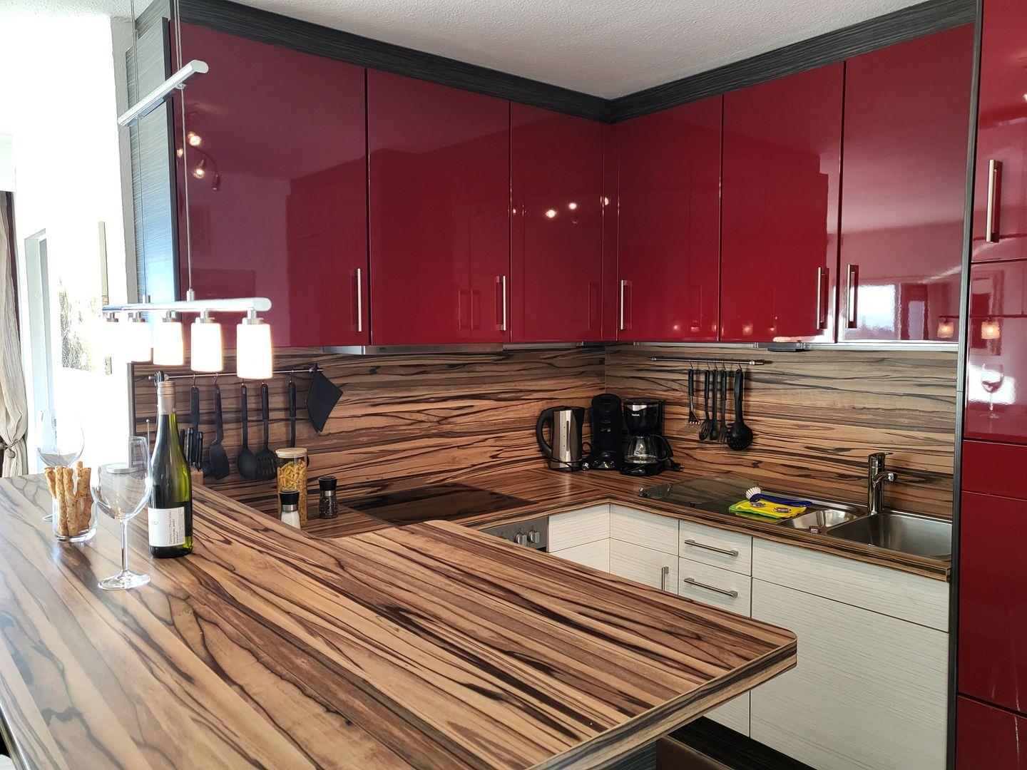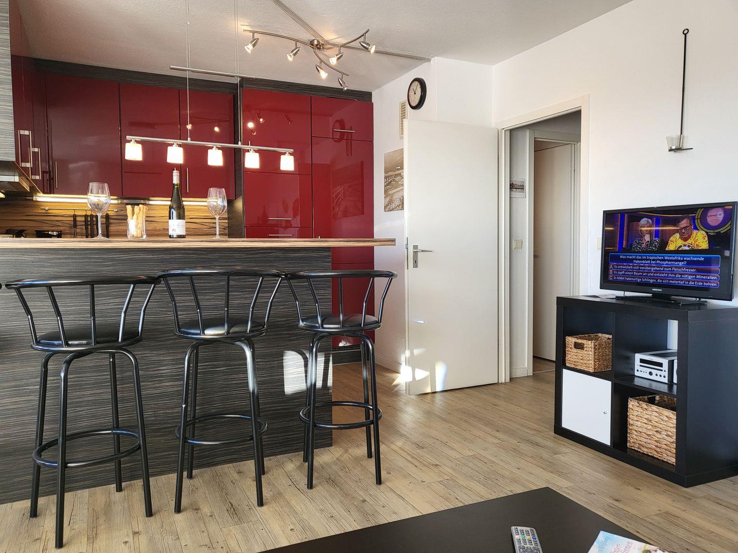 In den Raum integriert liegt die moderne Küche der Ferienwohnung, die mit einem edlen Esstresen vom Wohnraum abgetrennt ist.