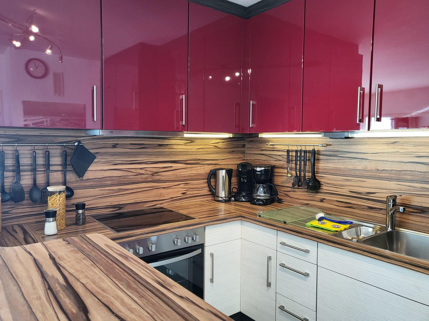 Zur Ausstattung der Küche gehören unter anderem Kochfeld und Backofen sowie Kühlschrank mit Gefrierfach sowie Geschirrspüler und Kaffeemaschine.