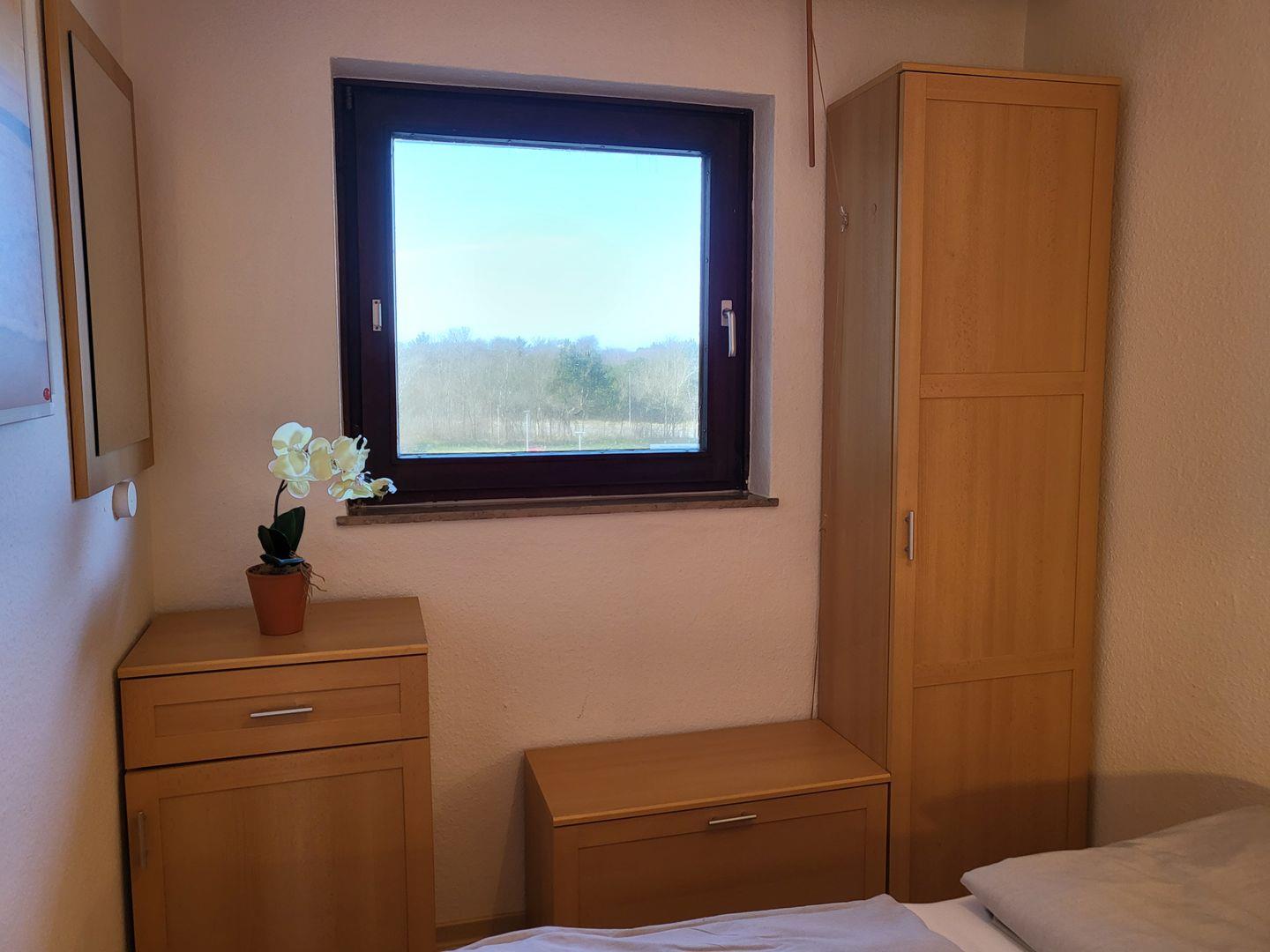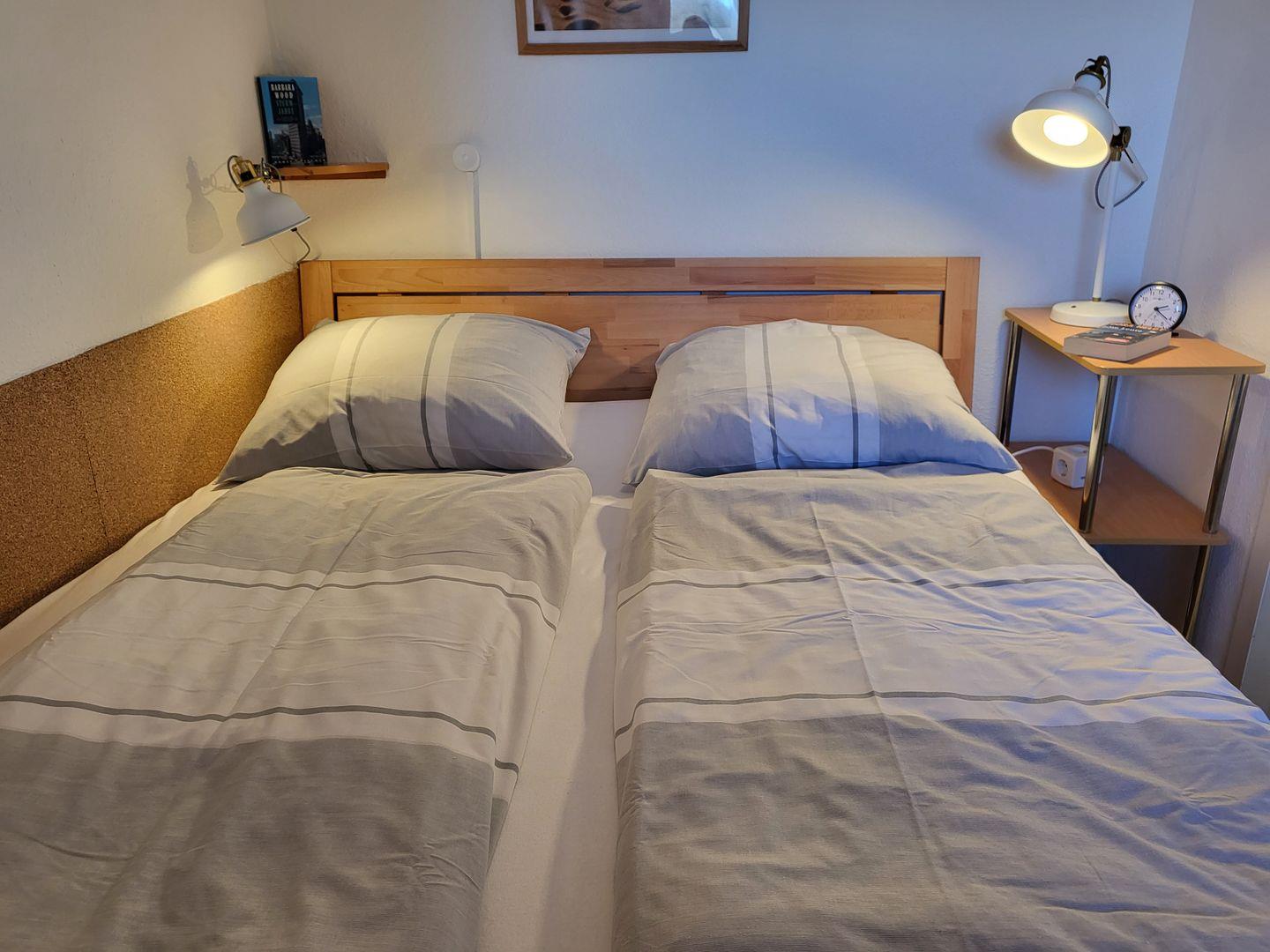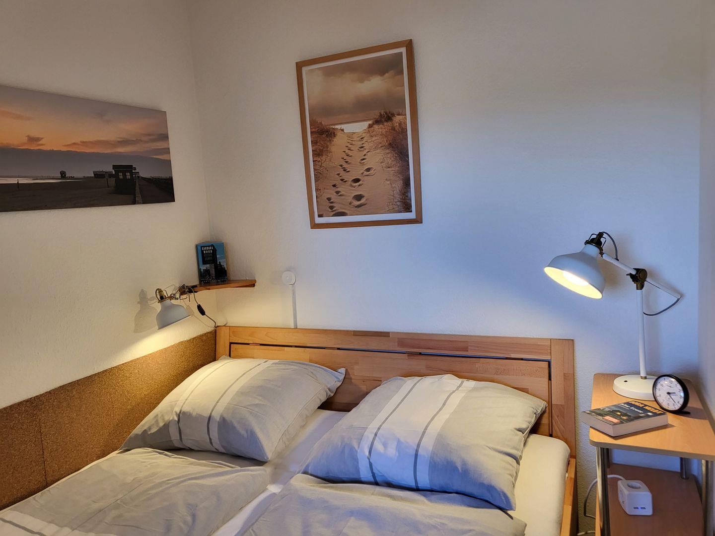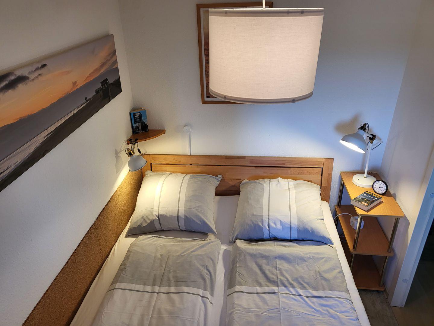 Ein separates Schlafzimmer mit 160x200cm Doppelbett steht zur Verfügung. Zur Ferienwohnung gehört zudem ein Duschbad mit WC.