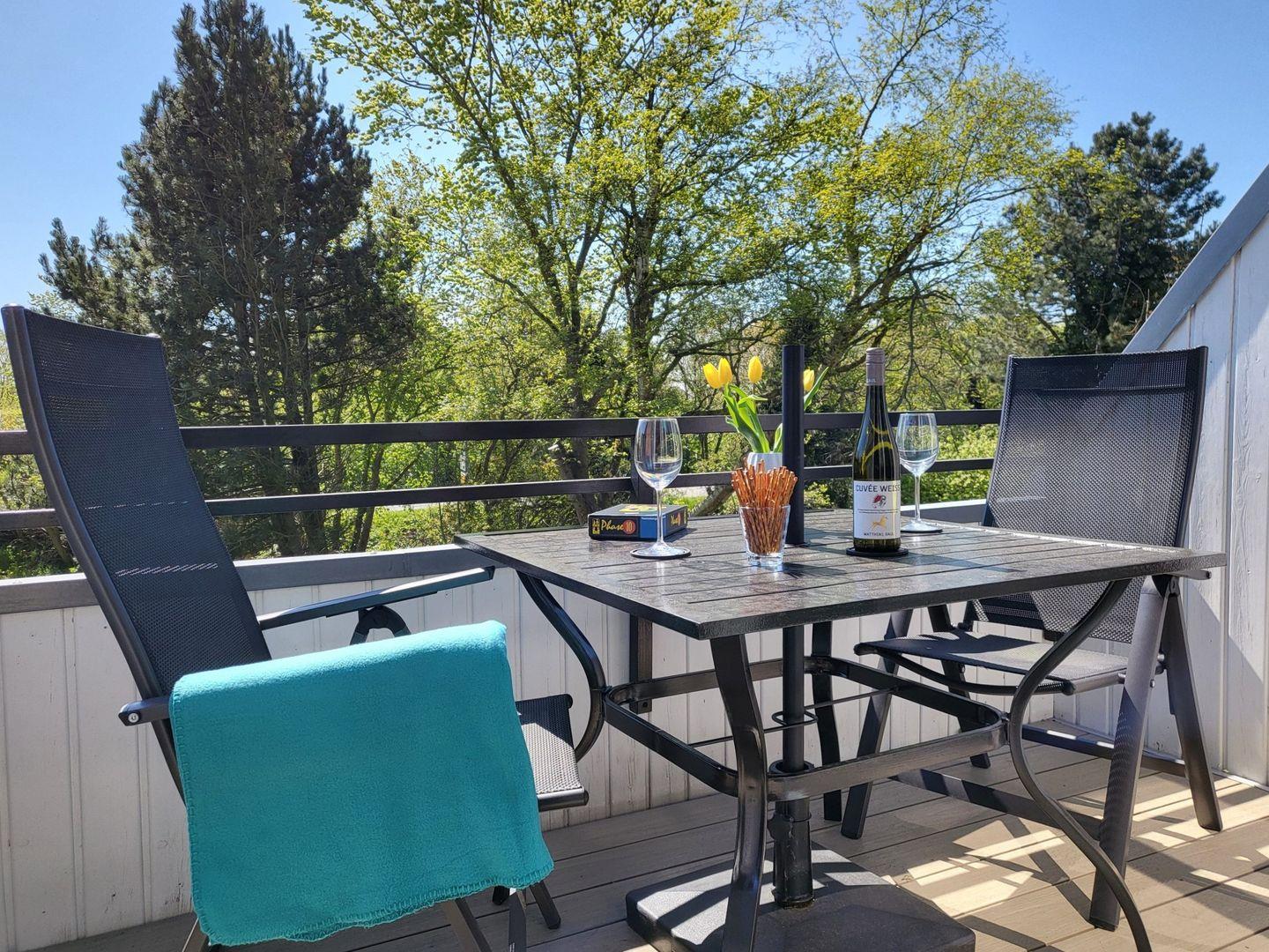 Der große, möblierte Balkon unterstreicht das romantische, einladende Feeling der Ferienwohnung und sorgt für einen tollen Blick ins Grüne. Zeit für ein bisschen Zweisamkeit.