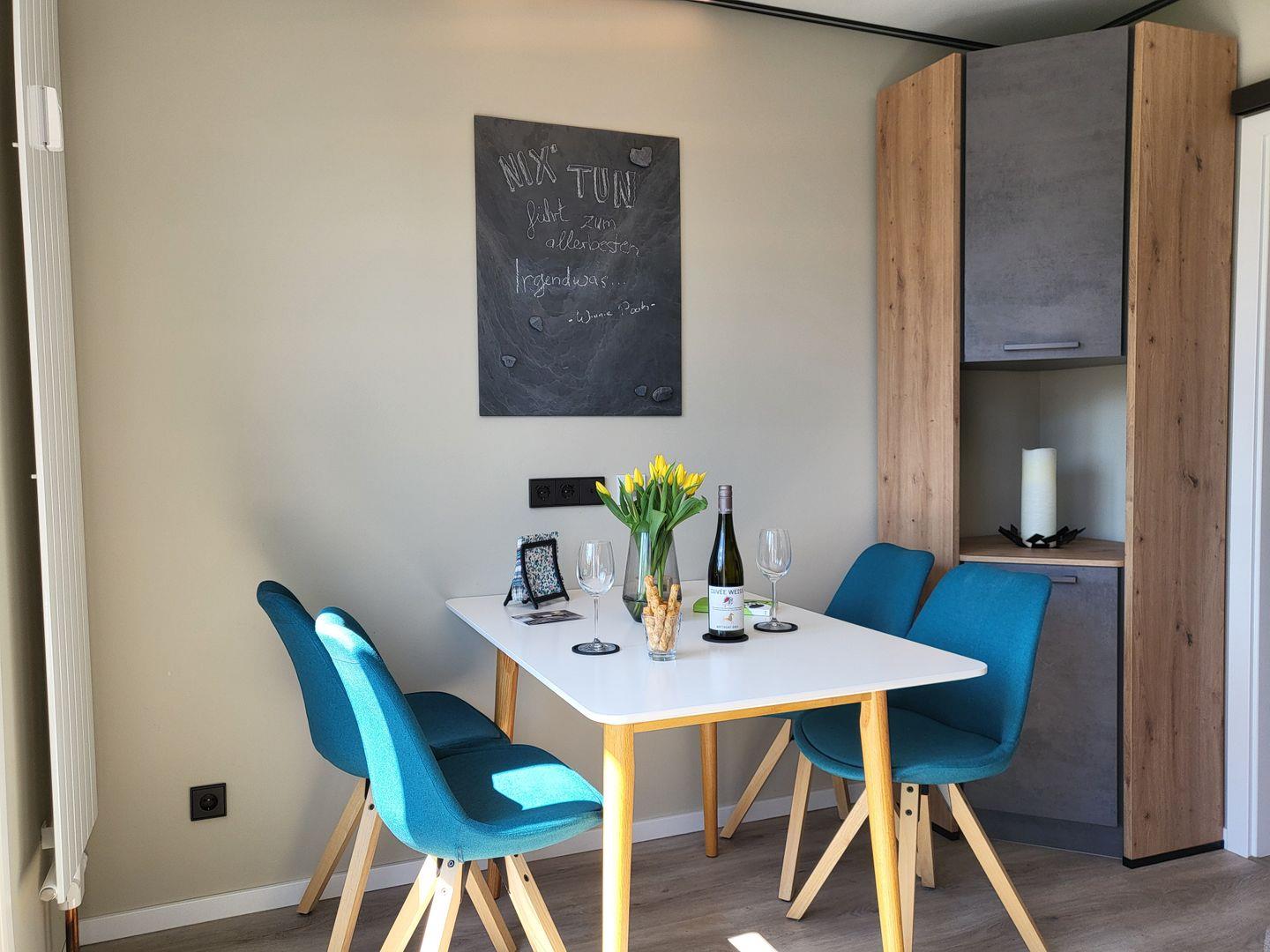 Extravagante, 2-Zimmer Ferienwohnung mit Balkon und Garage. Moderner Wohnraum mit Esstisch, gemütliche