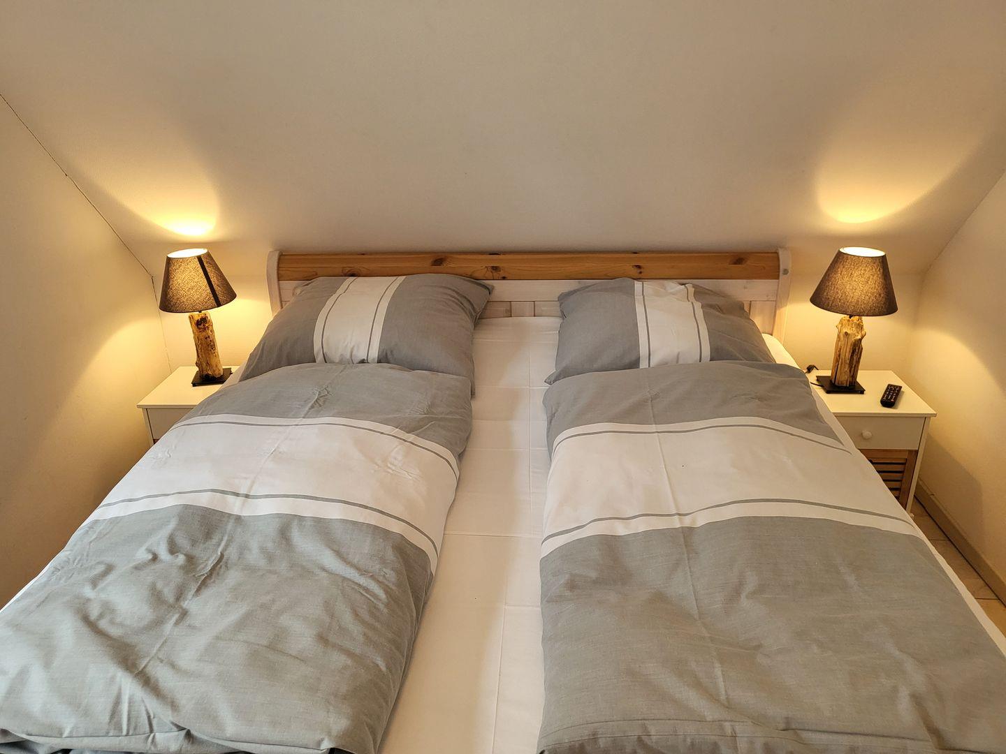 Im Obergeschoss sorgen zwei Schlafzimmer für erholsame Nächte. Beide sind mit komfortablen 180x200cm Doppelbetten ausgestattet, in einem ist ein weiterer Flachbild-TV vorhanden. Der Spitzboden ist zum gemütlichen Büro und Leseecke ausgebaut und eignet sich wunderbar als kleine Rückzugsmöglichkeit.