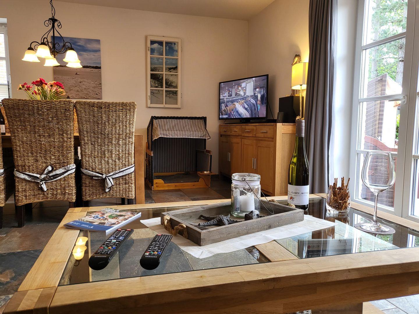 Im Erdgeschoss des im friesisch-skandinavischen Stil erbauten Hauses lädt das geräumige und wunderbar modern eingerichtete Wohnzimmer zu gemütlichen Stunden und leckeren Mahlzeiten ein. Zum Komfortprogramm gehören ein gemütliches Zweisitzer Sofa sowie zwei Sessel und der edle Esstisch mit einladenden Korbstühlen. Für die multimediale Unterhaltung sorgen Flachbild-TV mit DVD- und Blue-Ray-Player sowie kostenfreies W-LAN.