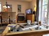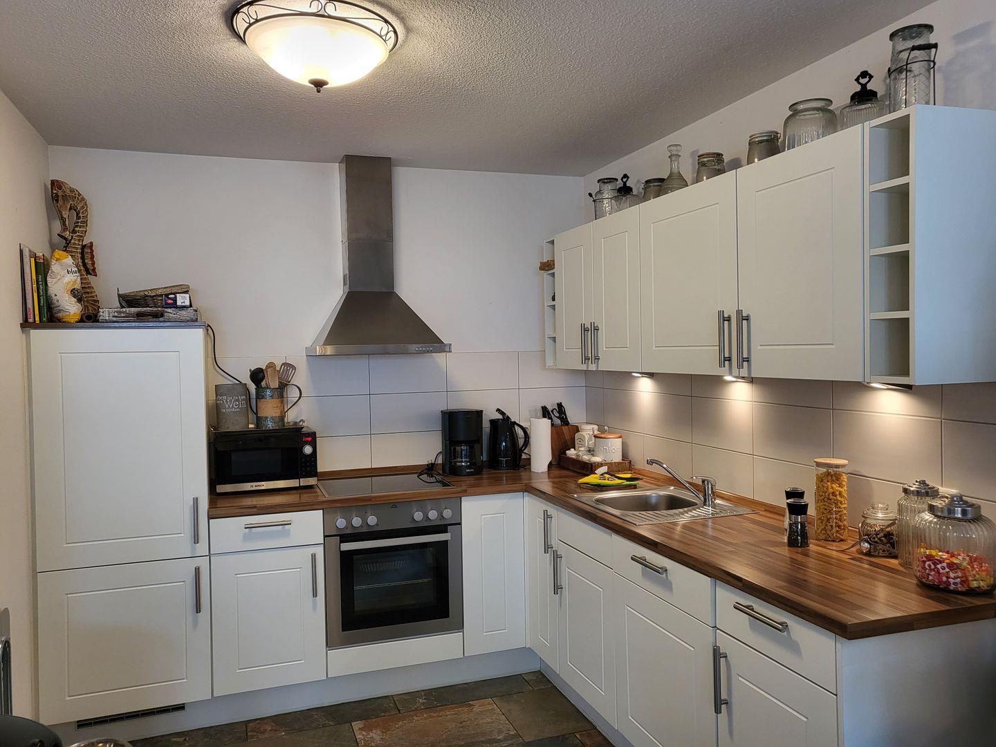 Die angrenzende, offene Küche ist modern und vollumfassend ausgestattet und verfügt unter anderem über ein großes Cerankochfeld und Herd sowie einen großen Kühlschrank mit Gefrierfach, Geschirrspüler und Kaffeemaschine. Ebenfalls steht im Erdgeschoss ein Gäste-WC samt bodengleicher Dusche zur Verfügung.