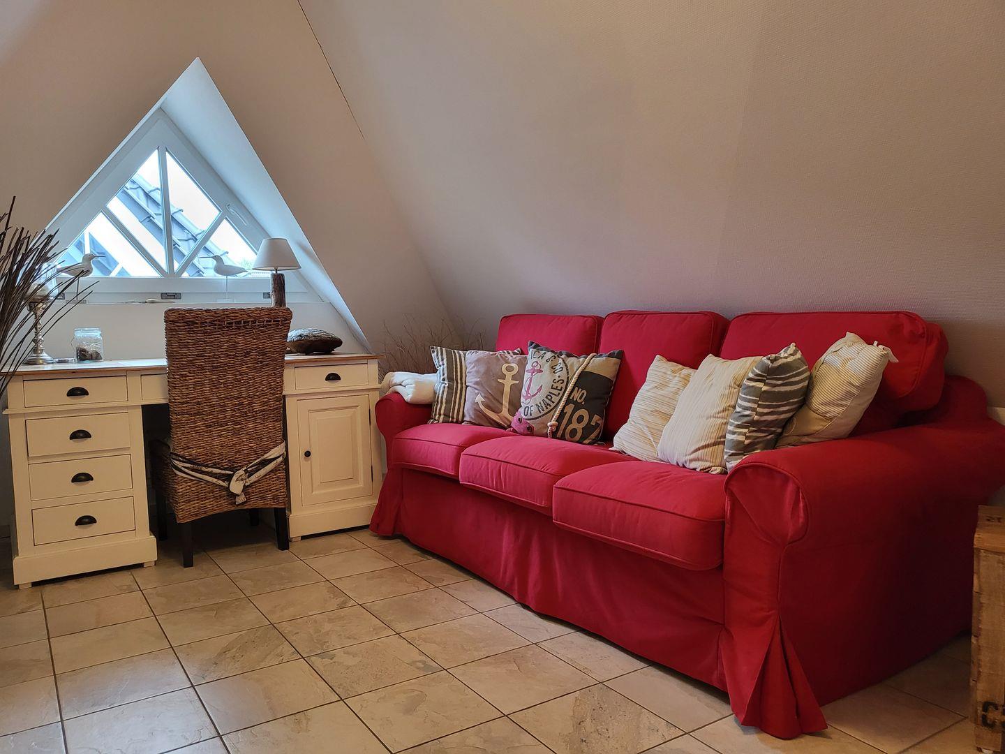 Dachgeschoss als Büro/Leseraum. Komplettausstattung für Hunde - bis zu zwei Hunde erlaubt, Gebühr 5,-€ pro Hund und Tag.