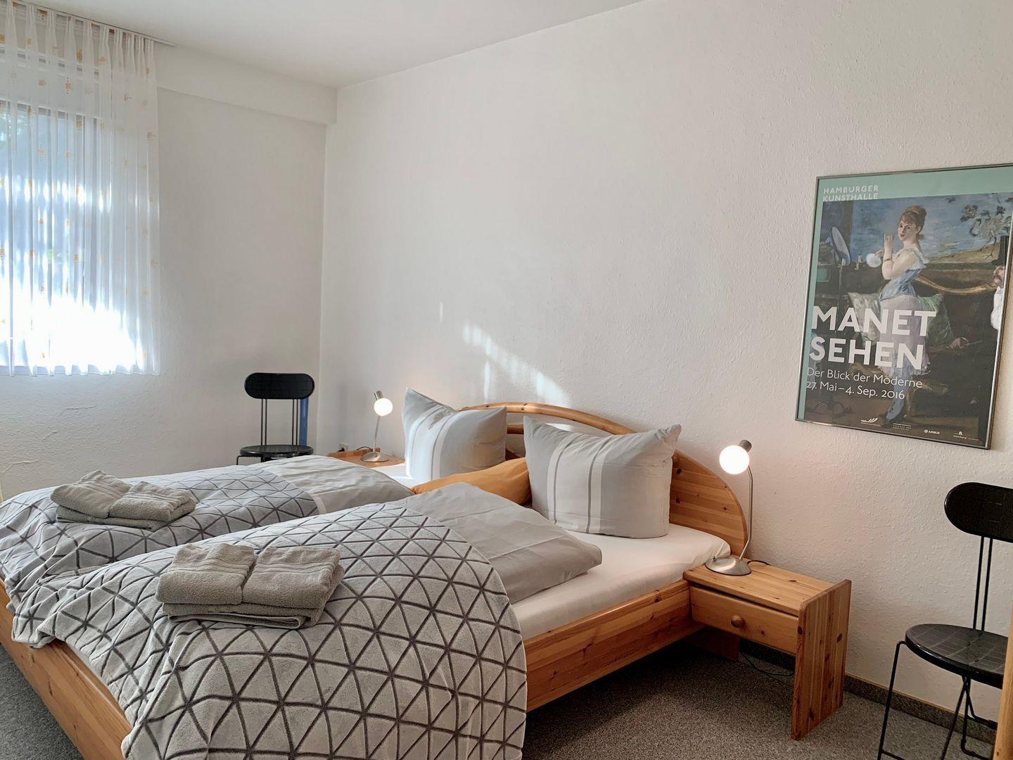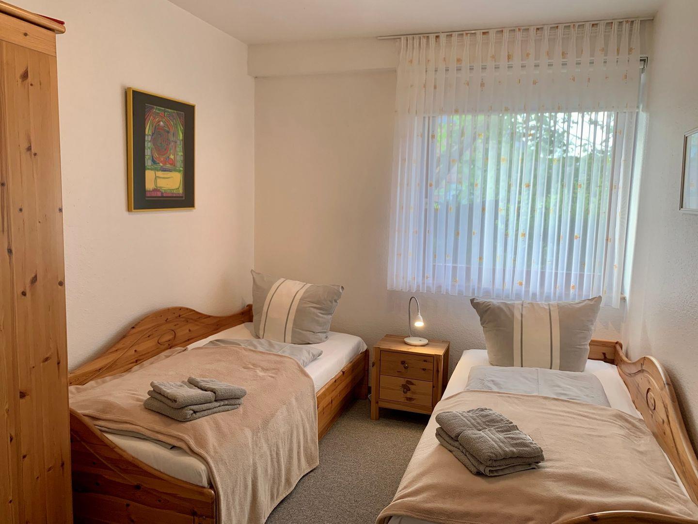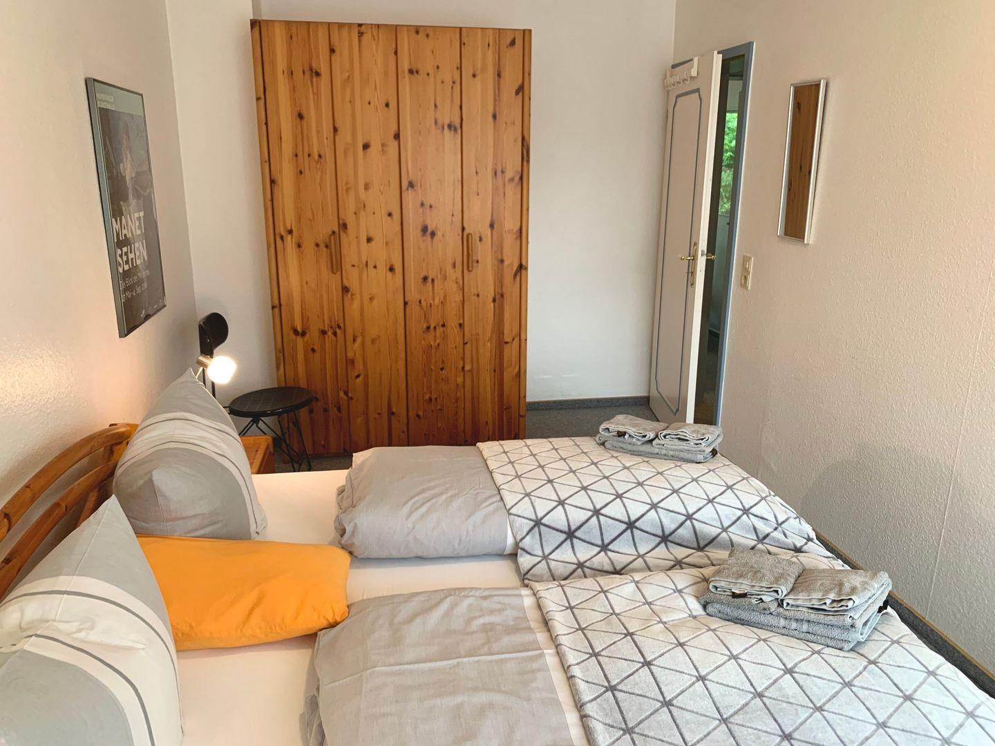 Die Ferienwohnung verfügt über zwei komfortable Schlafzimmer. Das erste ist ausgestattet mit einem großen 180x200cm Doppelbett, im zweiten Schlafzimmer stehen zwei Einzelbetten bereit. Zur Ferienwohnung gehören zwei Bäder. Eines ist als Duschbad mit WC eingerichtet, im zweiten stehen Badewanne und WC zur Verfügung.