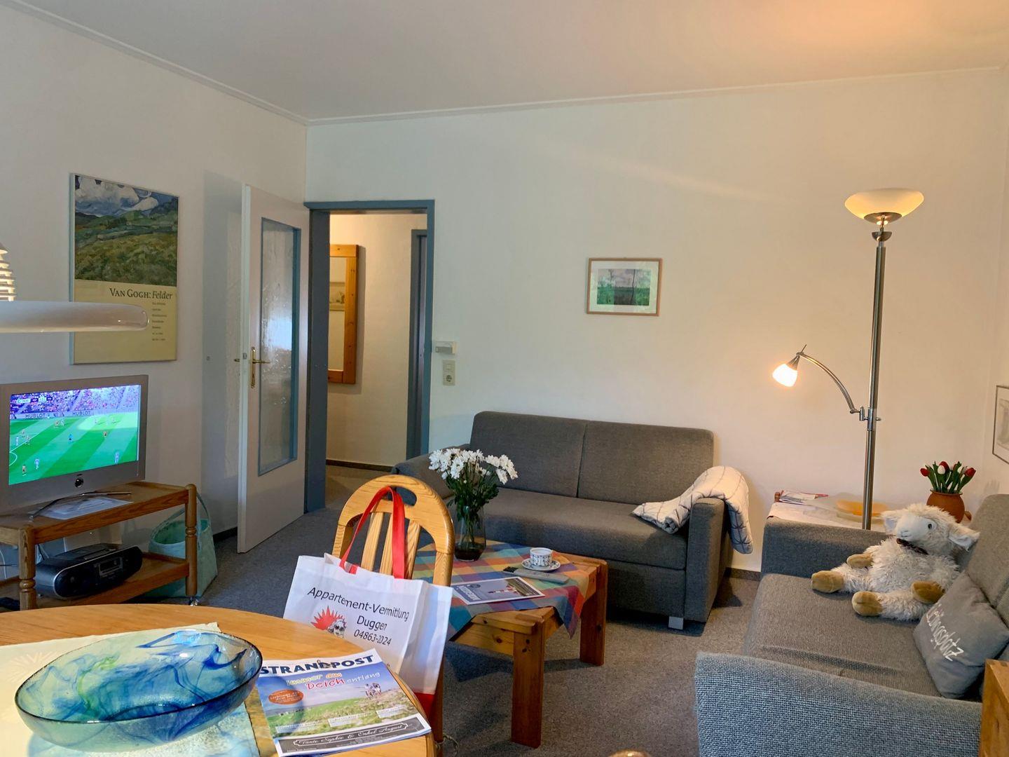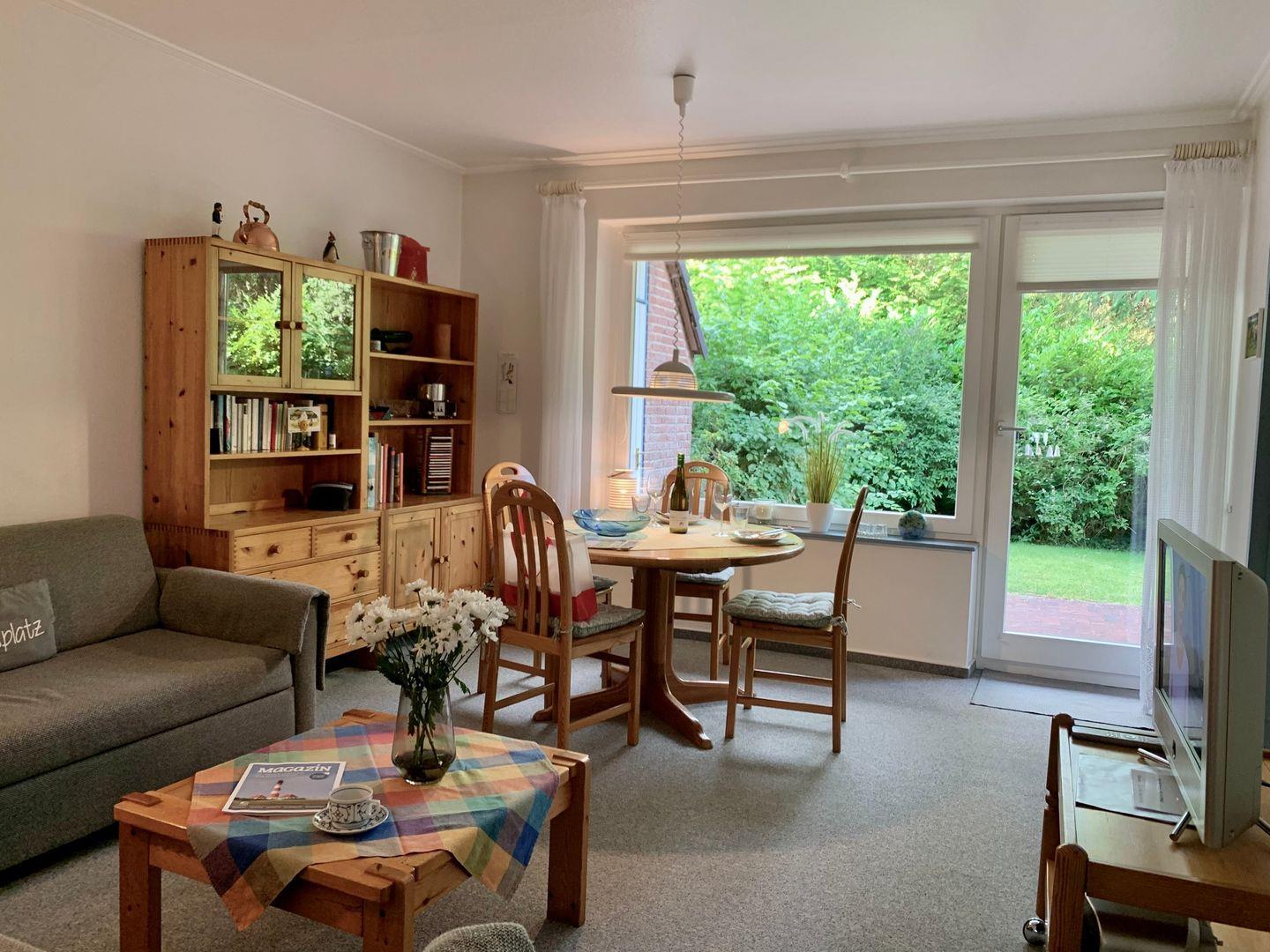 Durch die große Fensterfront und den Übergang zur Terrasse wirkt das Wohnzimmer wunderbar hell und einladend. Eine gemütliche Sitzecke mit zwei Sofas lädt zu gemütlichen Stunden ein, am Esstisch findet die ganze Familie Platz und geniest den Blick ins Grüne. Für die multimediale Unterhaltung im Urlaub sorgen ein großer LCD-HD TV nebst Musikanlage und kostenfreiem W-LAN.