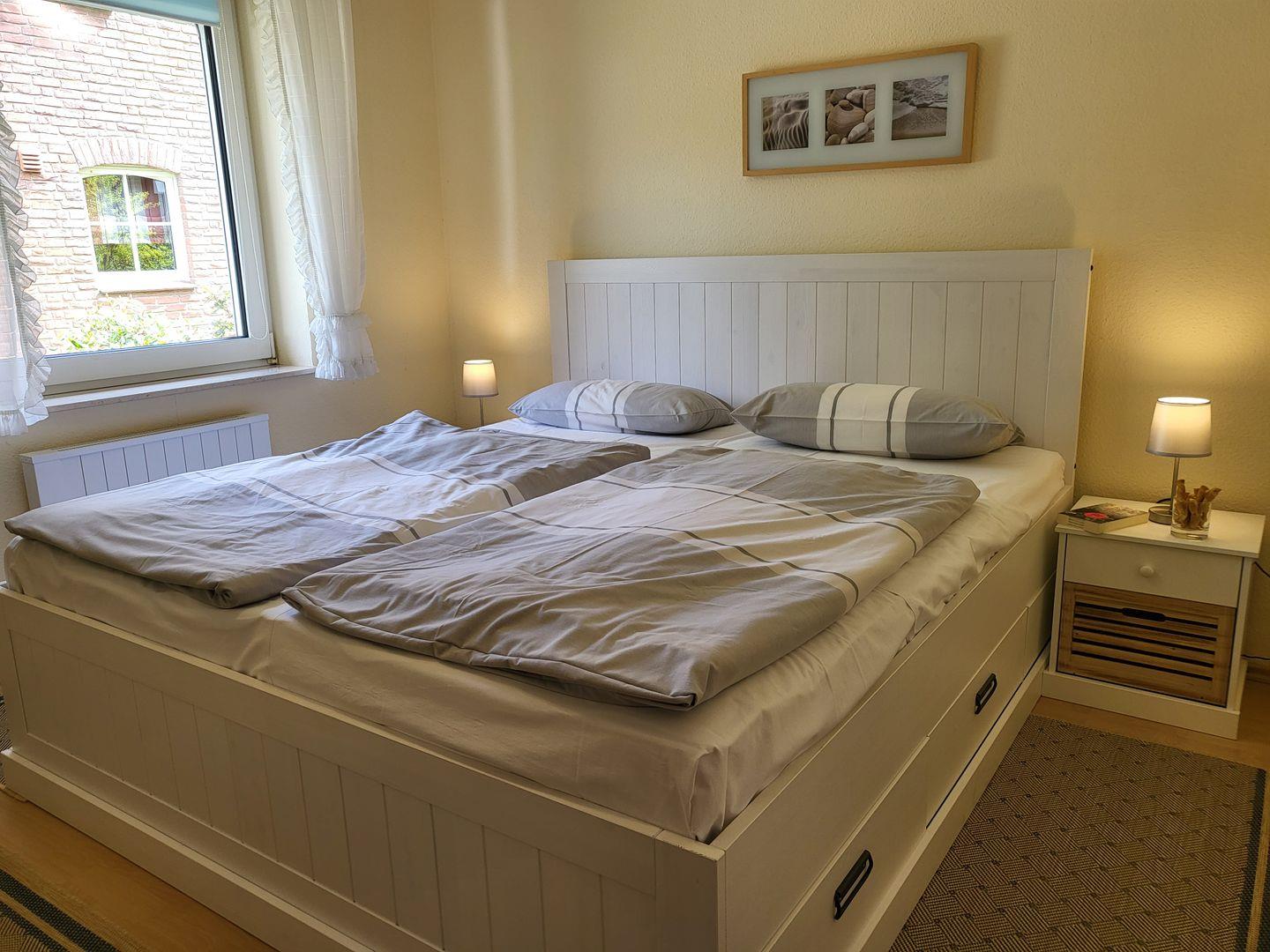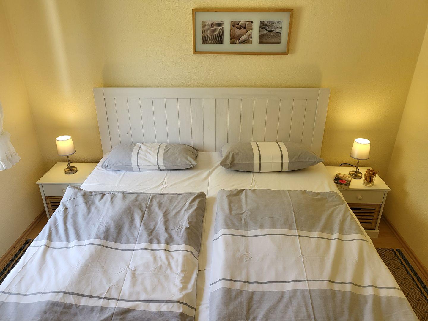 Im separaten Schlafzimmer steht ein 180x200cm Doppelbett zur Verfügung. Zur Ferienwohnung gehört ein Duschbad mit WC, eine Waschmaschine steht zur Verfügung.