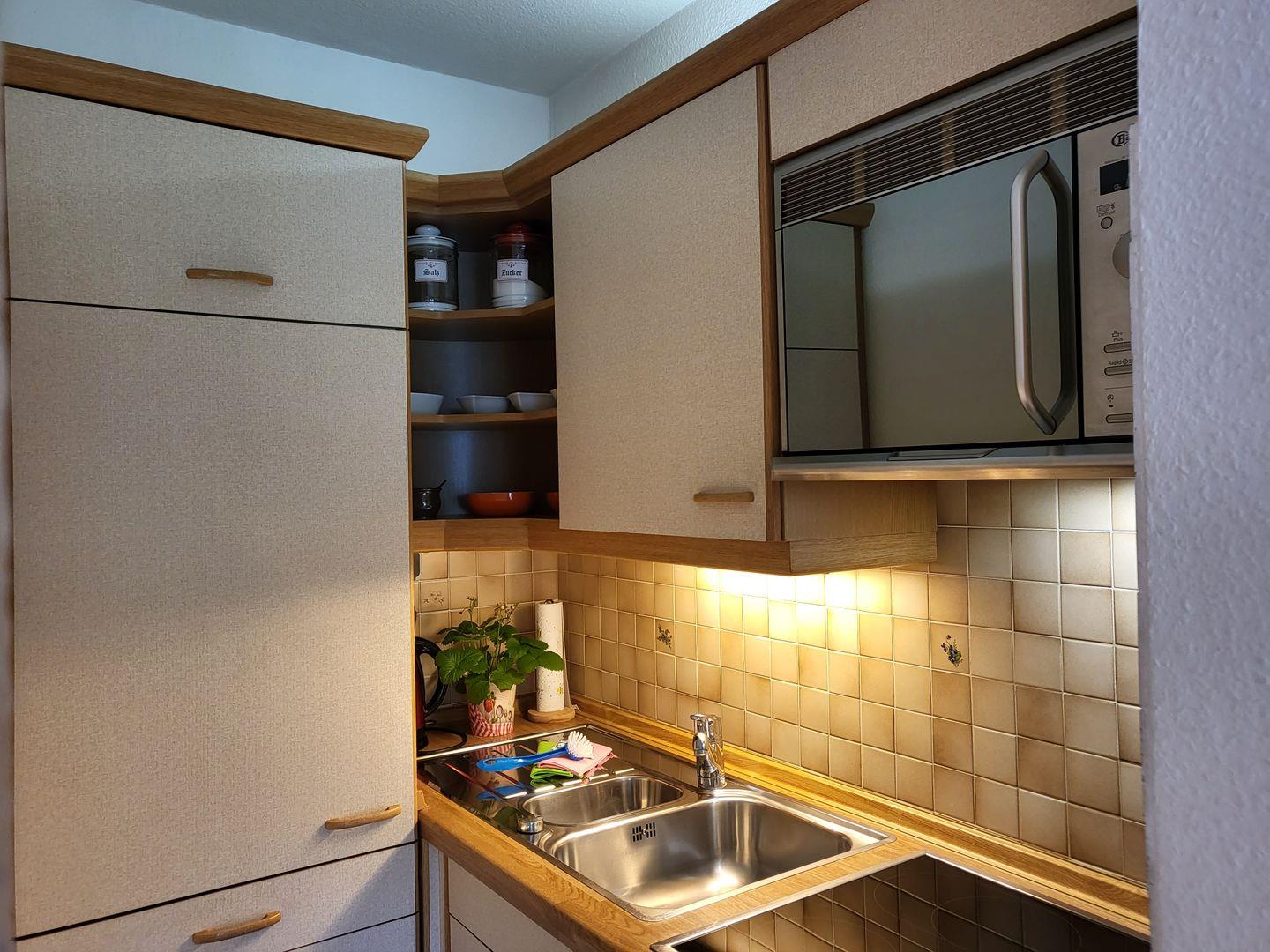 Die angrenzende Küchenzeile ist unter anderem ausgestattet mit Cerankochfeld und Backen, Kühlschrank mit Gefrierfach sowie Mikrowelle und Kaffeemaschine.
