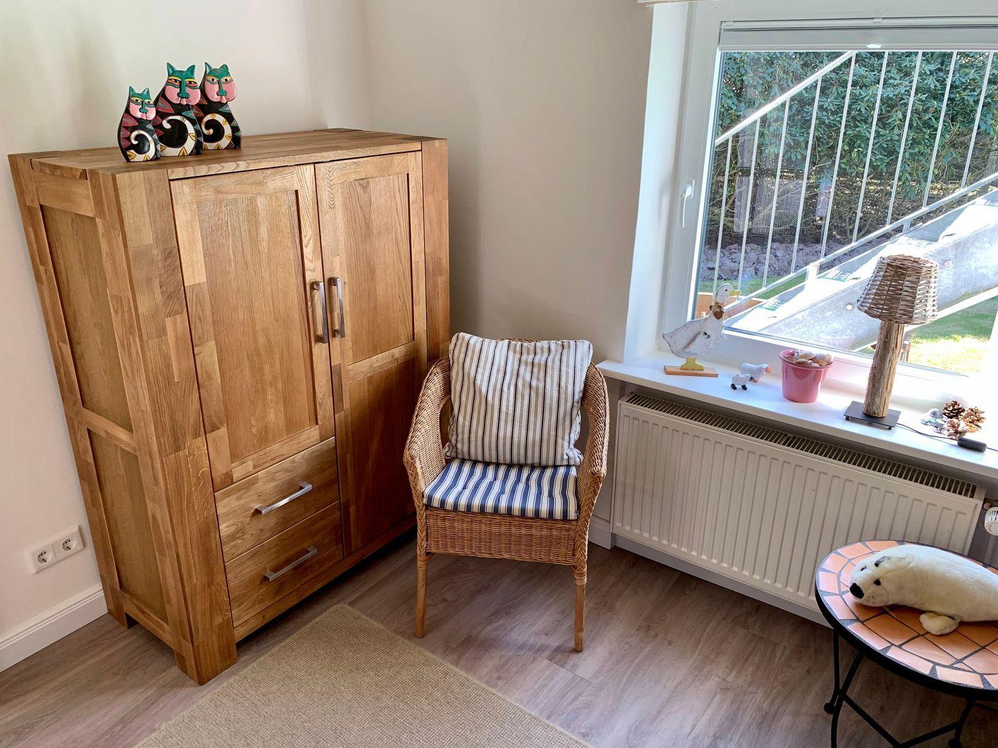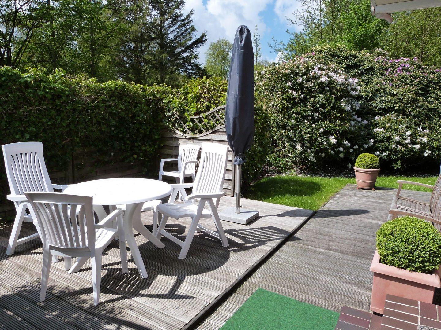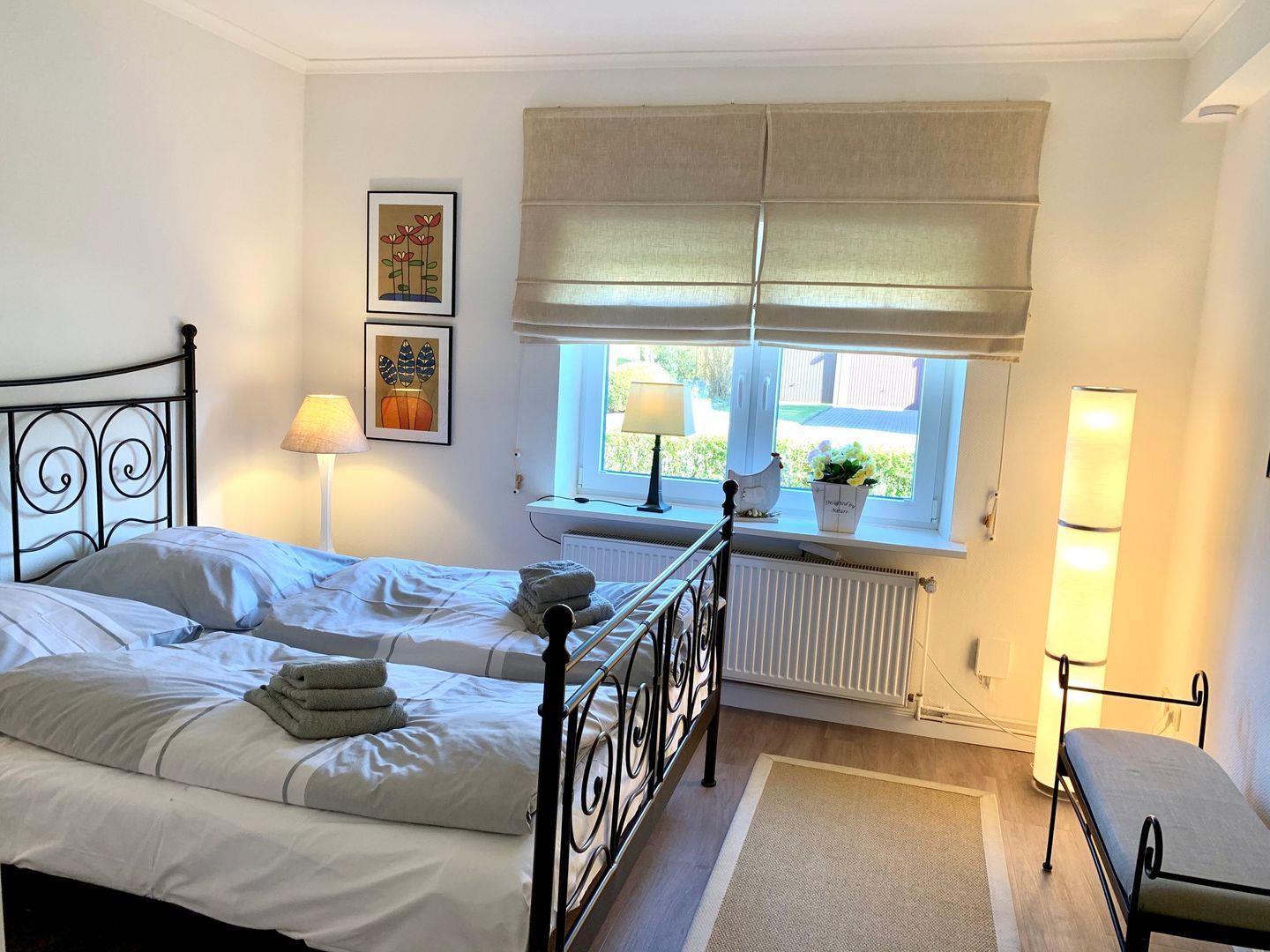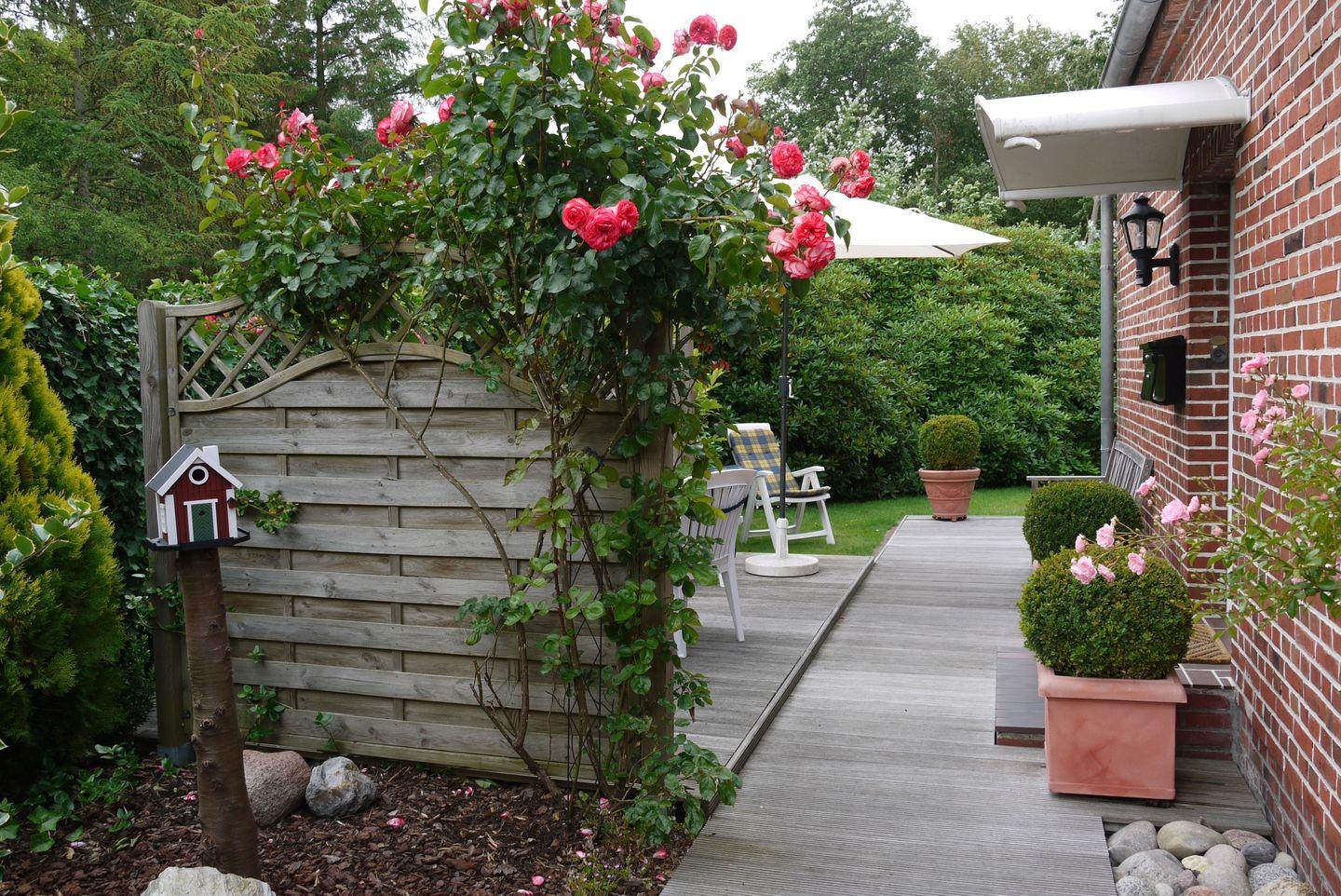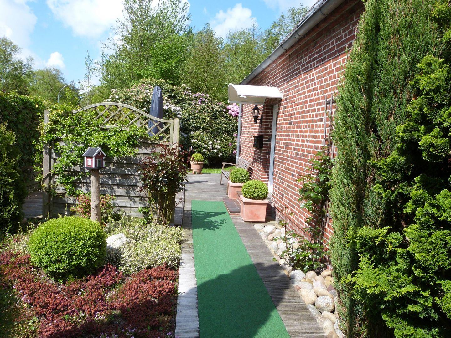 Moderne 3-Zimmer Ferienwohnung mit Terrasse und Garten. Ausgestattet mit hellem Wohnraum, separatemSchlafzimmer mit Doppelbett,