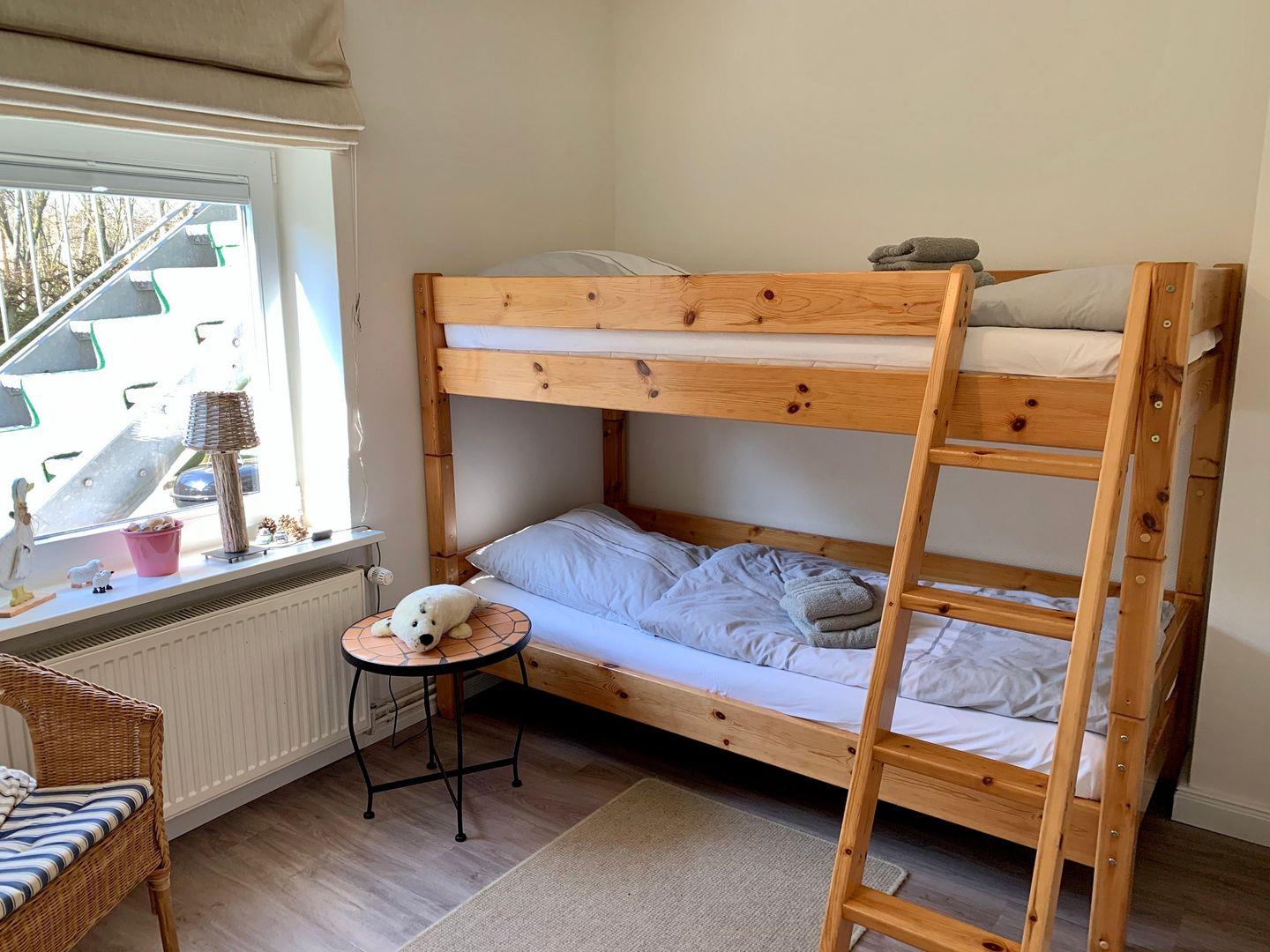 separatem Kinder-Zimmer mit Etagenbett, offener Küchenzeile zum Wohnzimmer sowie Duschbad mit WC.