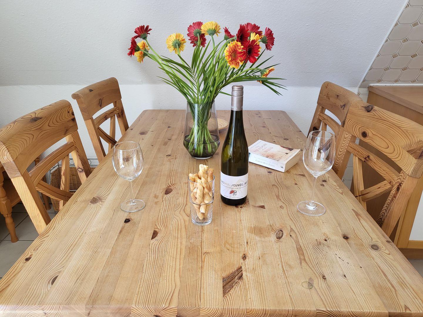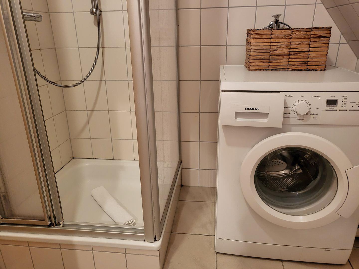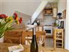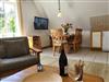 Die angrenzende Küche ist gut ausgestattet. Vorhanden sind weiterhin Duschbad mit WC, ein separates Schlafzimmer mit Einzelbett, das ausgebaute Dachgeschoss mit 2 Einzelbetten sowie eine Waschmaschine.