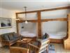 Der kombinierte Wohn-Schlafraum ist ausgestattet mit einer gemütlichen Sitzecke, dem Esstisch der Ferienwohnung und zwei Kojenbetten.