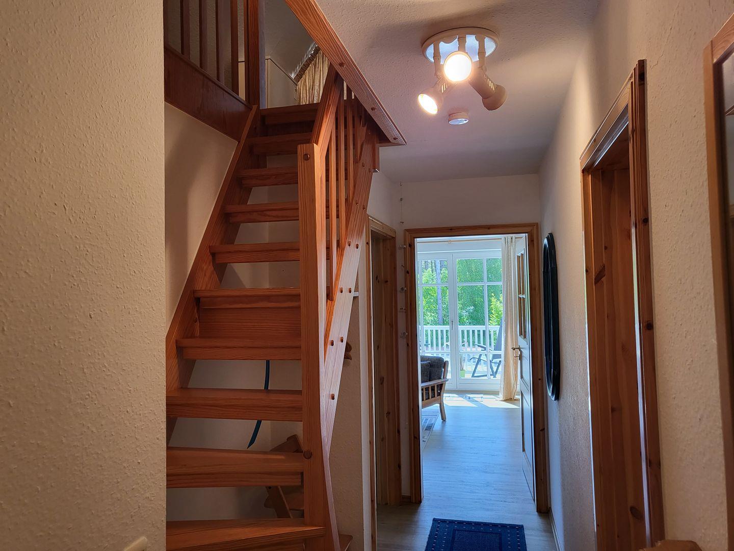 Die Treppe vom Flur ins Dachgeschoss ist sehr steil und schmal, für Menschen mit Mobilitätseinschränkungen nicht geeignet.