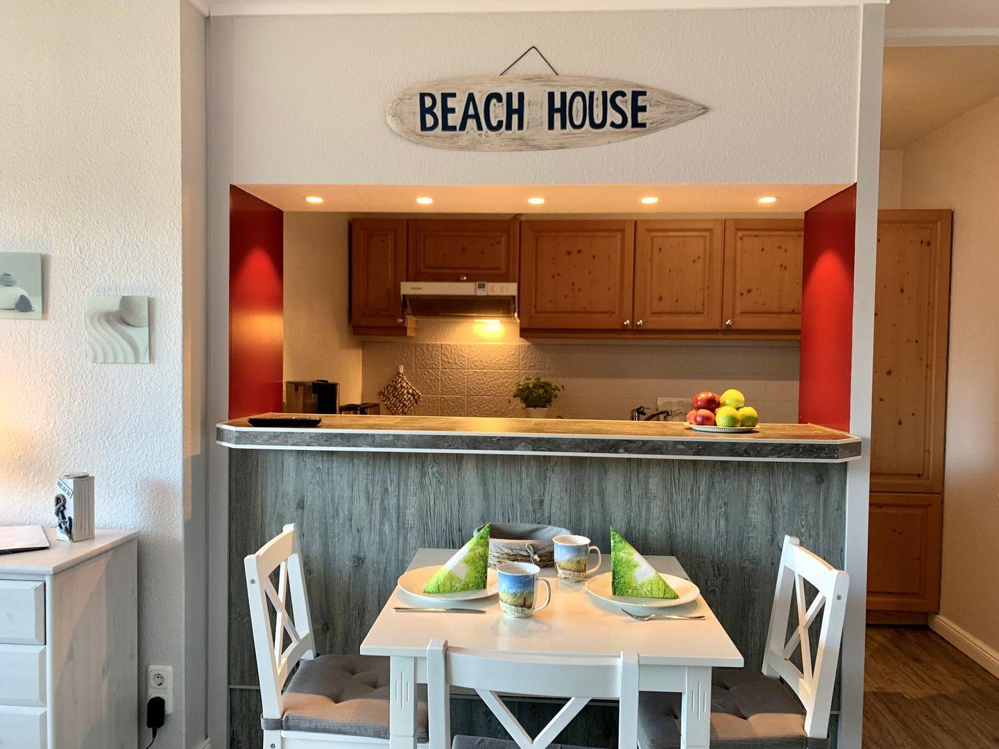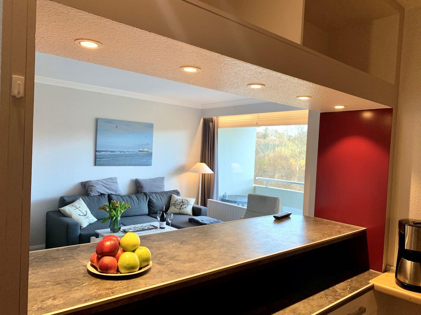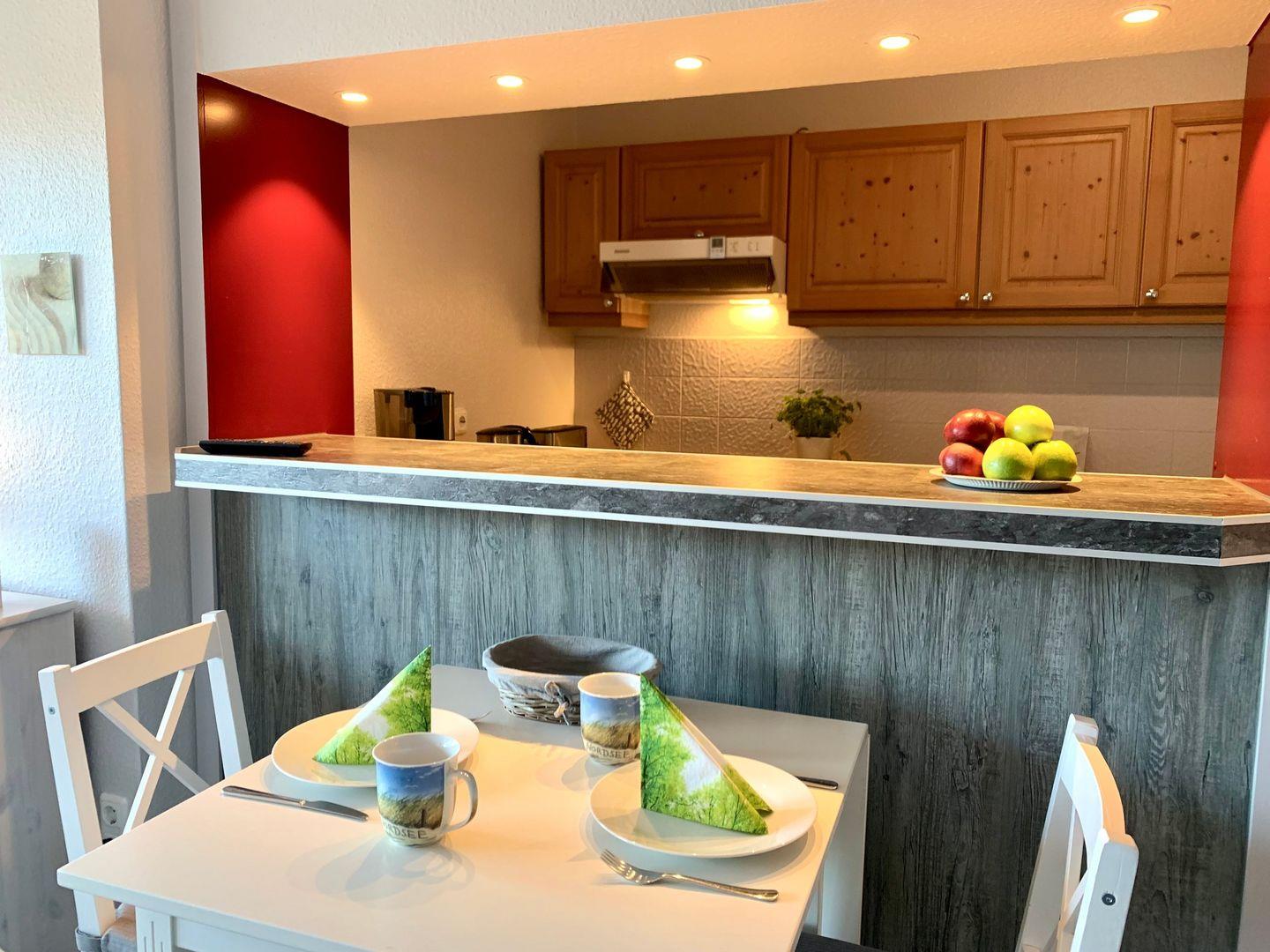 Die in den Raum integrierte, offene Küche ist mit einem Tresen vom Wohnraum separiert.