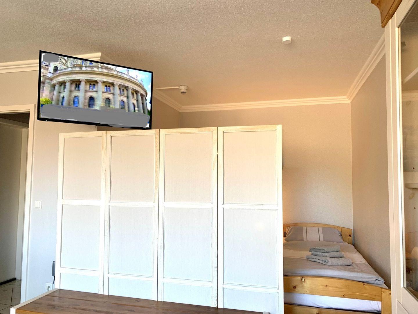 hinter einem Paravan gibt es zwei Einzelbetten, 1 Schlafzimmer mit Einzelbett.