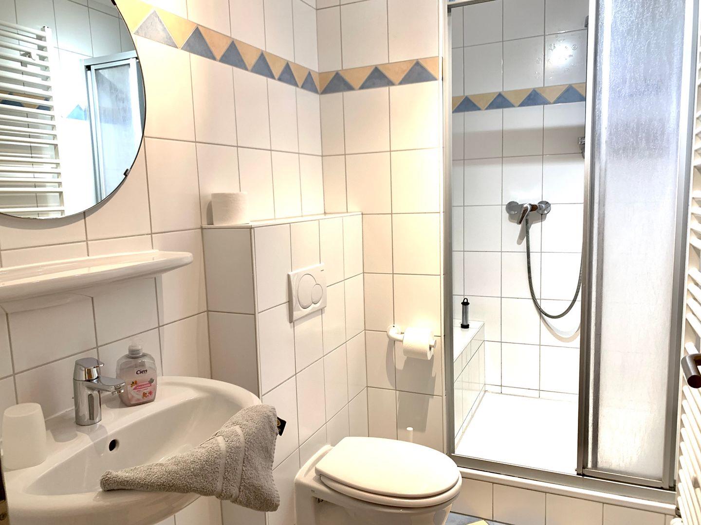 Duschbad mit WC und Waschmaschine. PKW-Stellplatz, Fahrrad-Abstellmöglichkeit, WLAN und Spielfläche vorhanden.