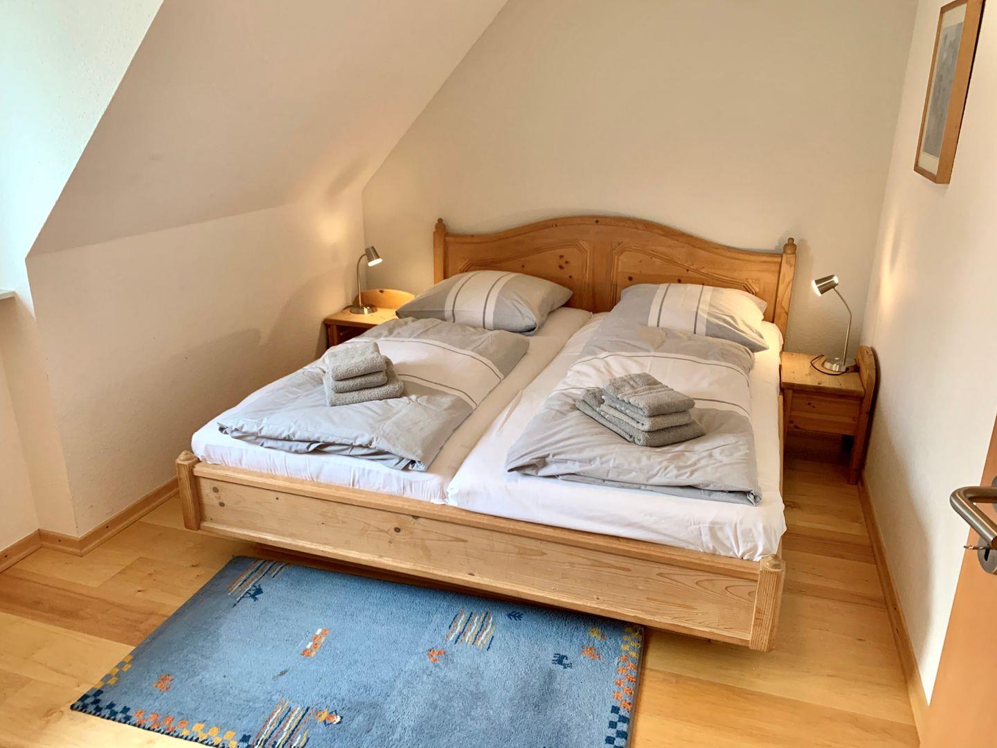 Im Obergeschoss stehen 3 Schlafzimmer zur Verfügung. Eines ist ausgestattet mit großen 180x200cm Doppelbett, ein weiteres mit zwei Einzelbetten. Das dritte Schlafzimmer verfügt über ein Etagenbett mit Ausfallschutz.