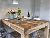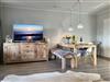 Wohnraum mit moderner Eckschlafcouch und Esstisch sowie integrierter Küchenzeile.