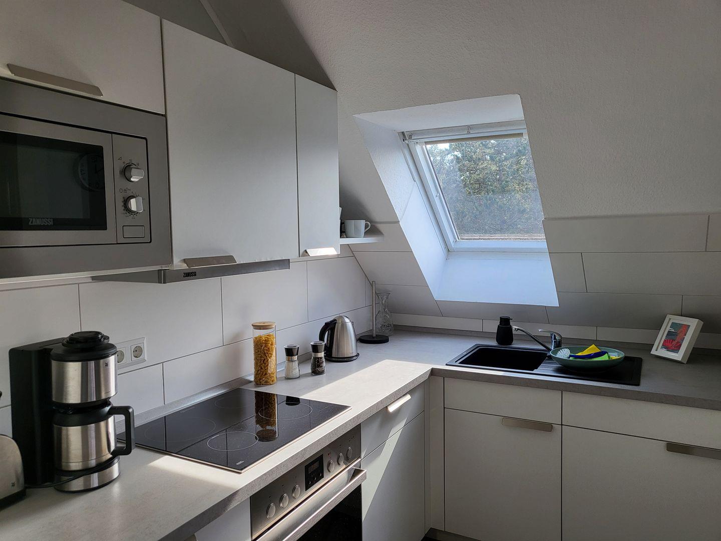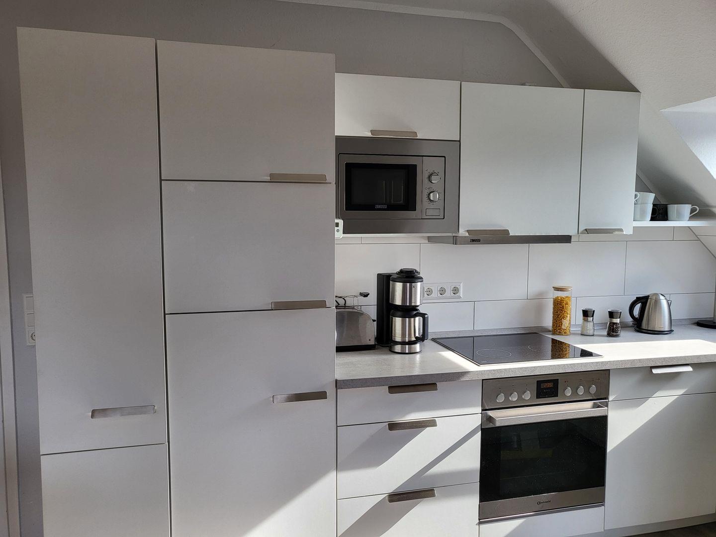 In den Raum integriert liegt die sehr gut ausgestattete Küchenzeile, die unter anderem über Induktionskochfeld und Backofen sowie einen großen Kühlschrank mit Gefrierfach, einen Geschirrspüler sowie Mikrowelle und Kaffeemaschine verfügt.