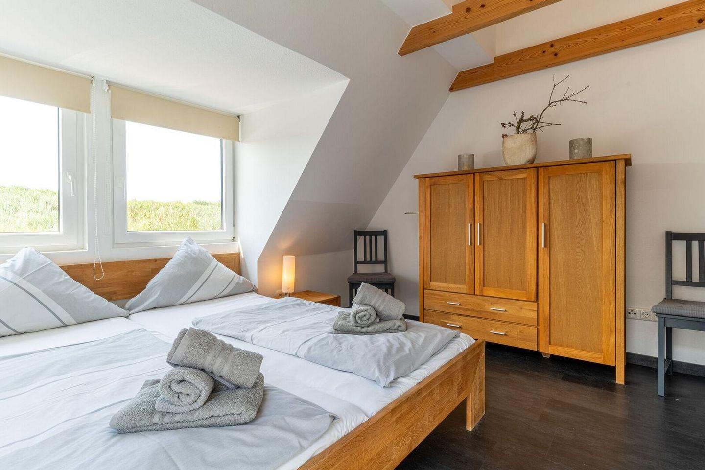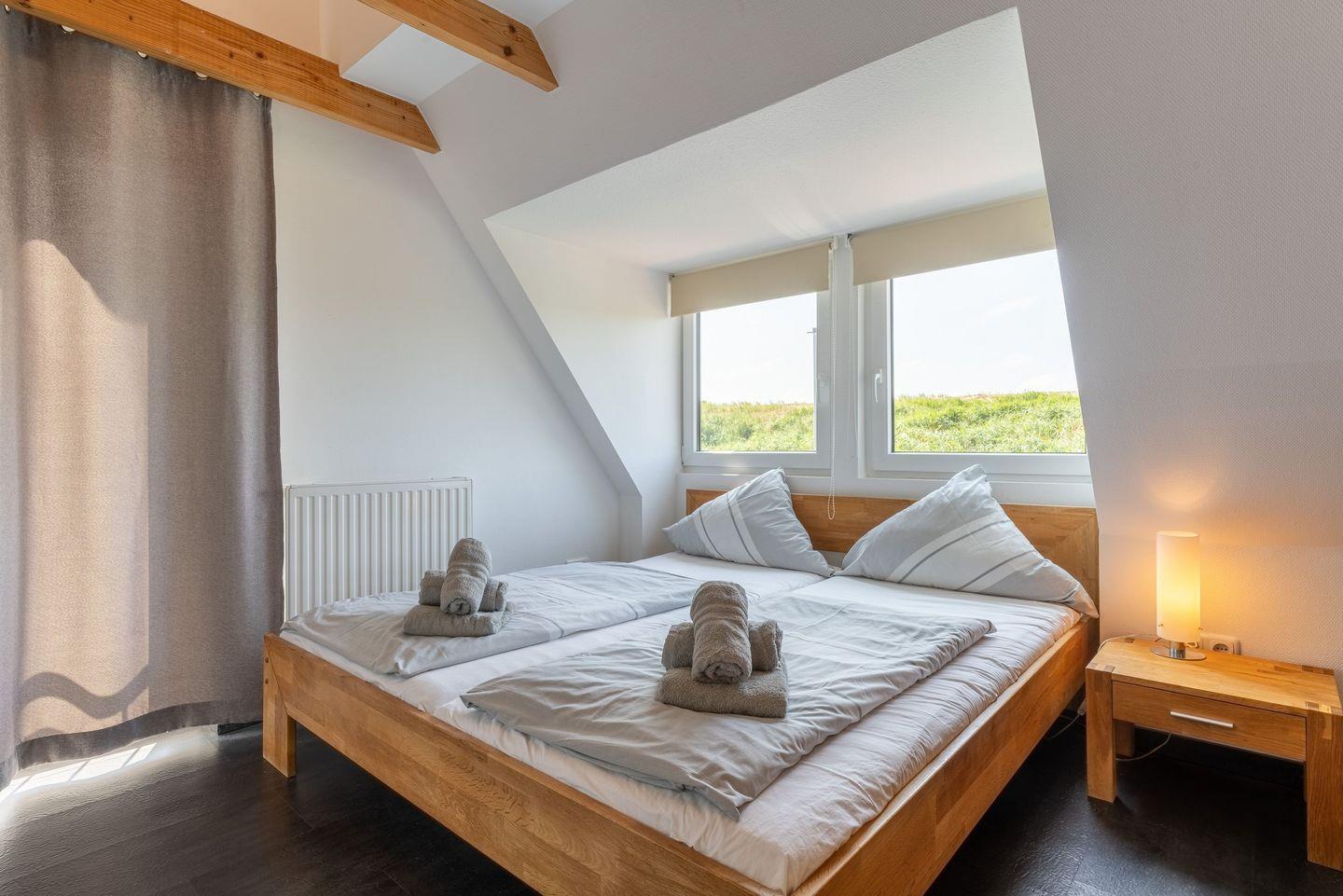 Im ersten OG befindet sich das edel eingerichtete Schlafzimmer mit 180x200cm Doppelbett.