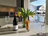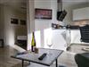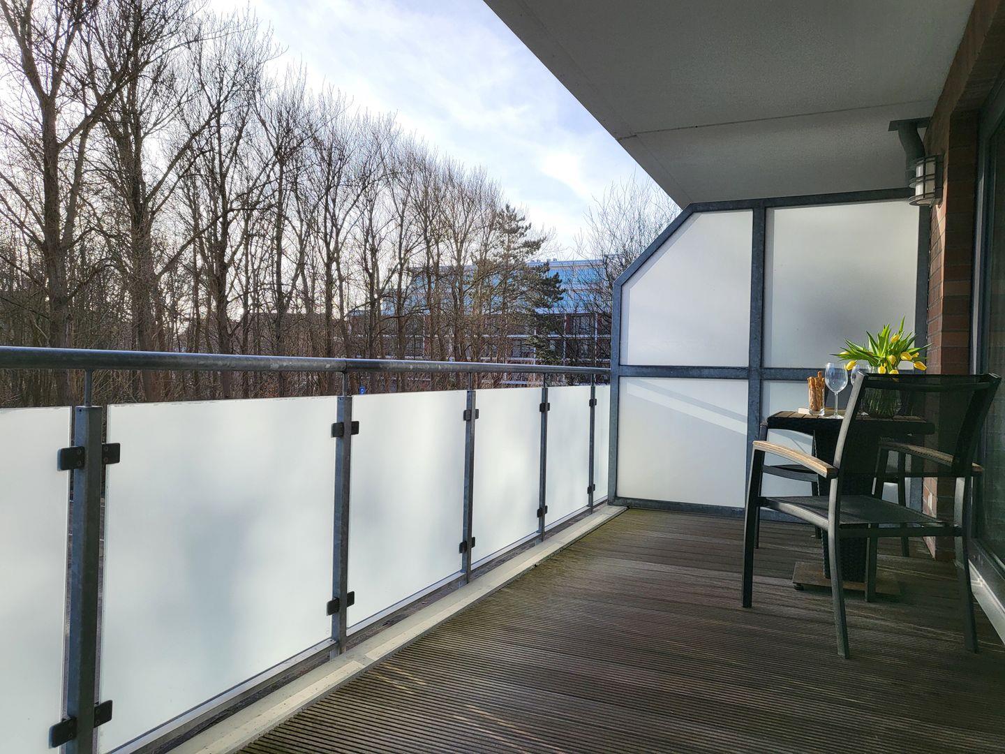 Der kombinierte Wohn- Schlafraum wirkt durch das große Panoramafenster und den Durchgang zum möblierten Balkon wunderbar hell und einladend. Hier stehen ein Sofa und zwei edle Ledersessel zur Verfügung. Für die multimediale Unterhaltung sorgen ein großer Flachbild-TV und kostenfreies W-LAN. Integriert in den Wohnraum ist die kompakte Küche der Ferienwohnung, hier stehen unter anderem Cerankochfeld, Kühlschrank sowie Geschirrspüler und Kaffeemaschine zur Verfügung.
