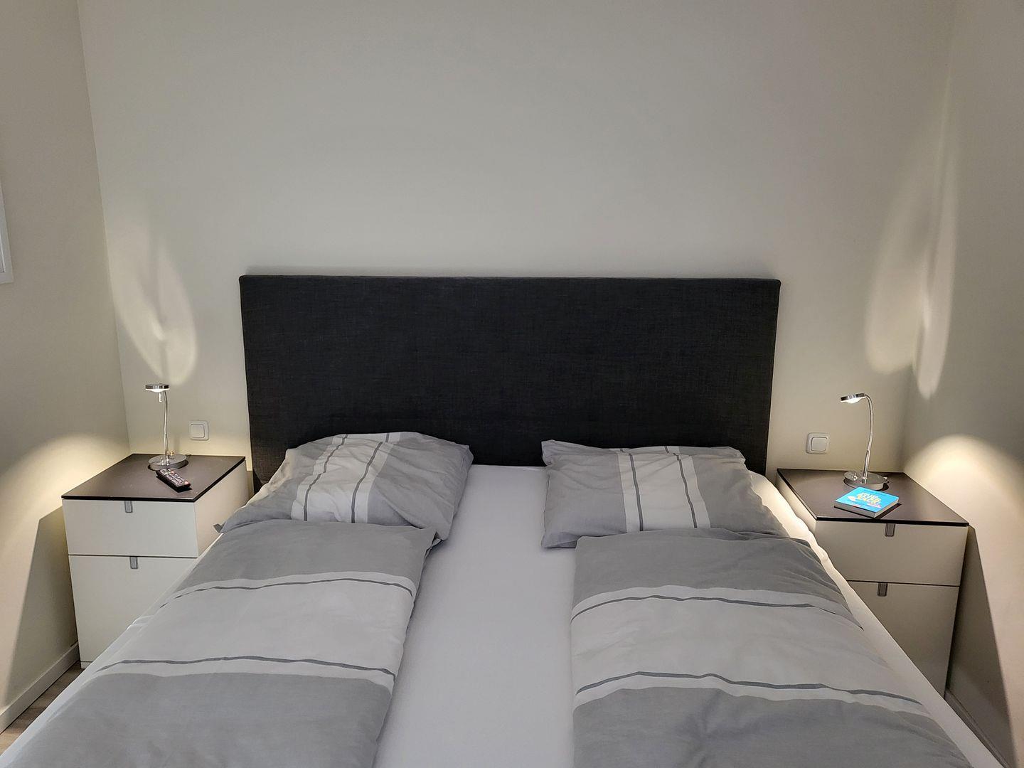Ebenfalls zum Wohnraum gehört der offene Schlafbereich. Hier sorgt ein Verdunklungsvorhang für ungestörten Schlaf, ein komfortables 180x200cm Boxspringbett steht nebst Flachbild-TV zur Verfügung.