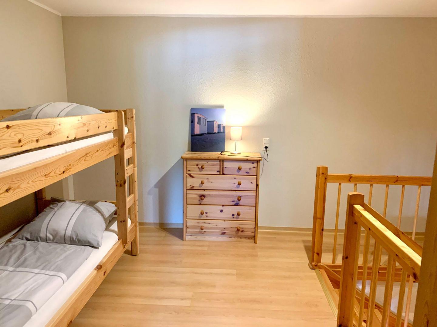 Ein Schlafzimmer ist mit komfortablem 180x200cm Doppelbett ausgestattet, auf der Galerie zum Flur steht ein Etagenbett zur Verfügung.