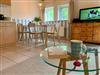 Das freundlich und maritim eingerichtete Wohnzimmer ist mit einer gemütlichen Couch sowie einem ansprechenden Essbereich ausgestattet.
