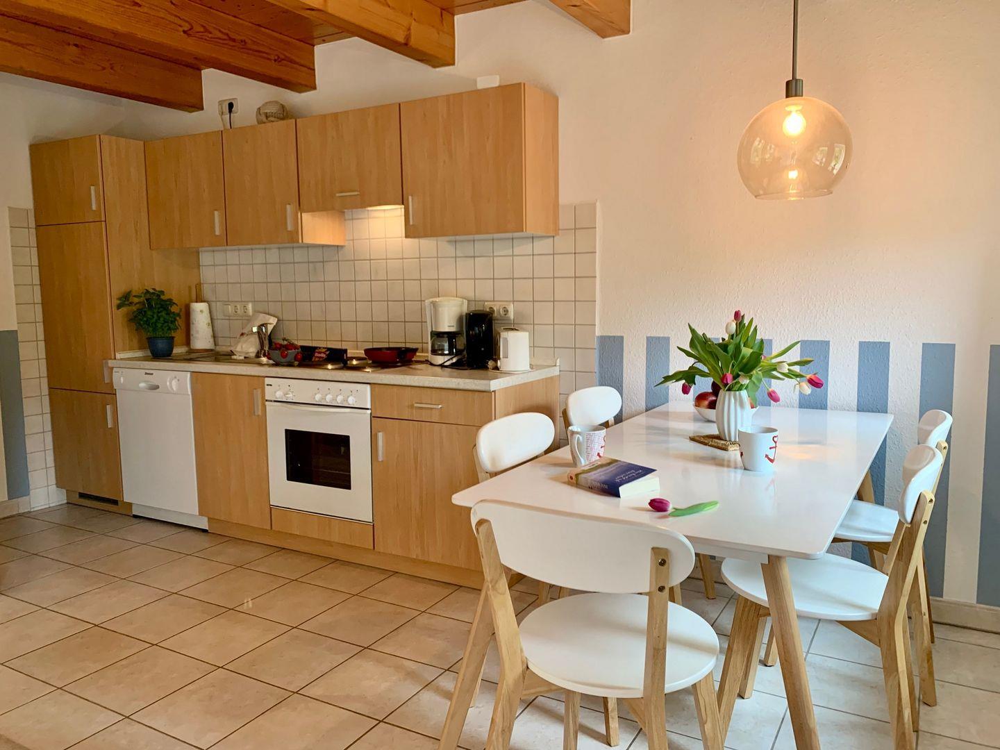Ins Wohnzimmer integriert ist die Küchenzeile, die über Herd und Backofen sowie Kaffeemaschine, Wasserkocher und Toaster verfügt.