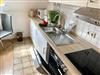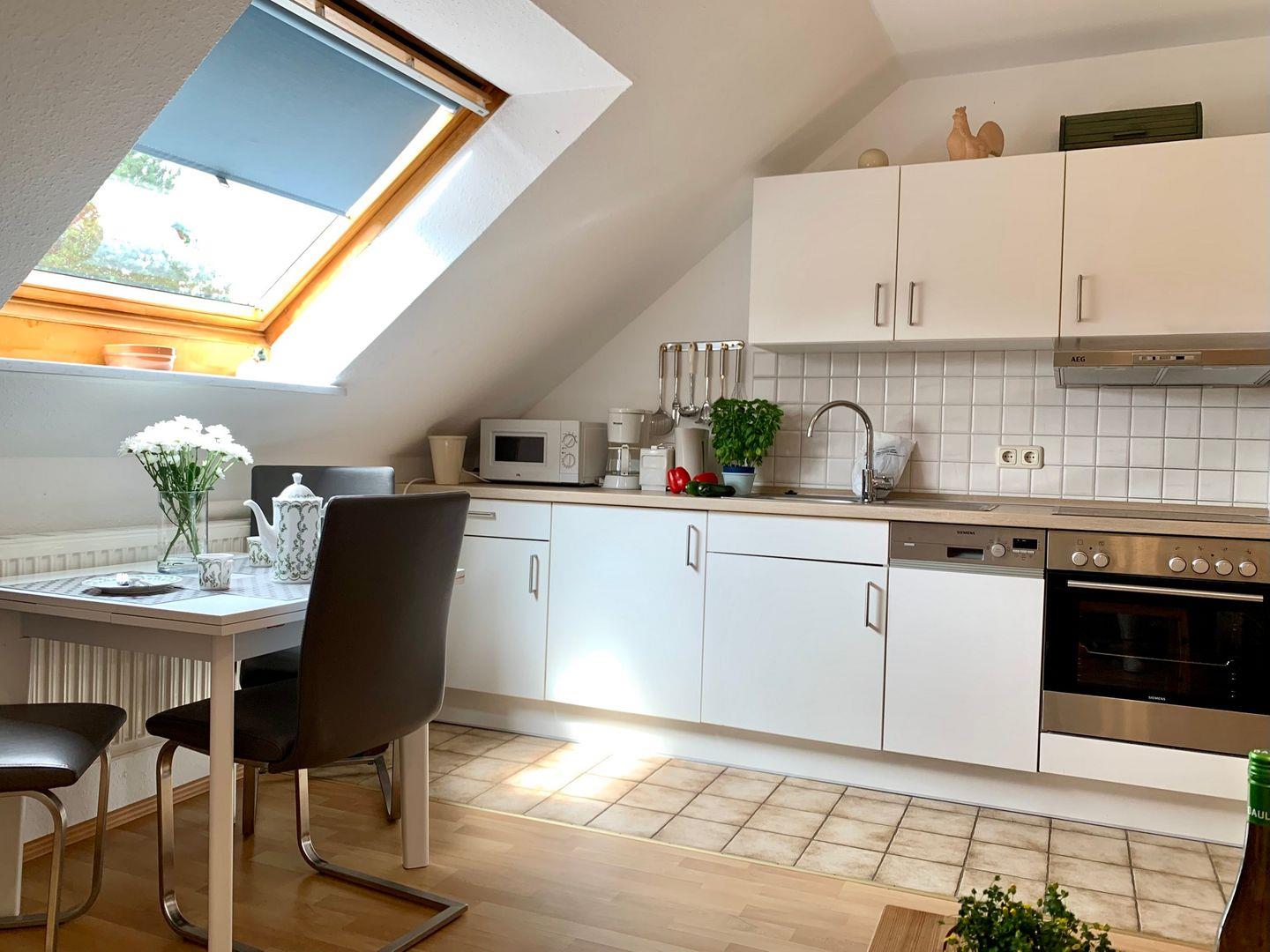 Die integrierte Küchenzeile ist gut ausgestattet und verfügt unter anderem über Cerankochfeld und Backofen sowie Kaffeemaschine und Toaster.