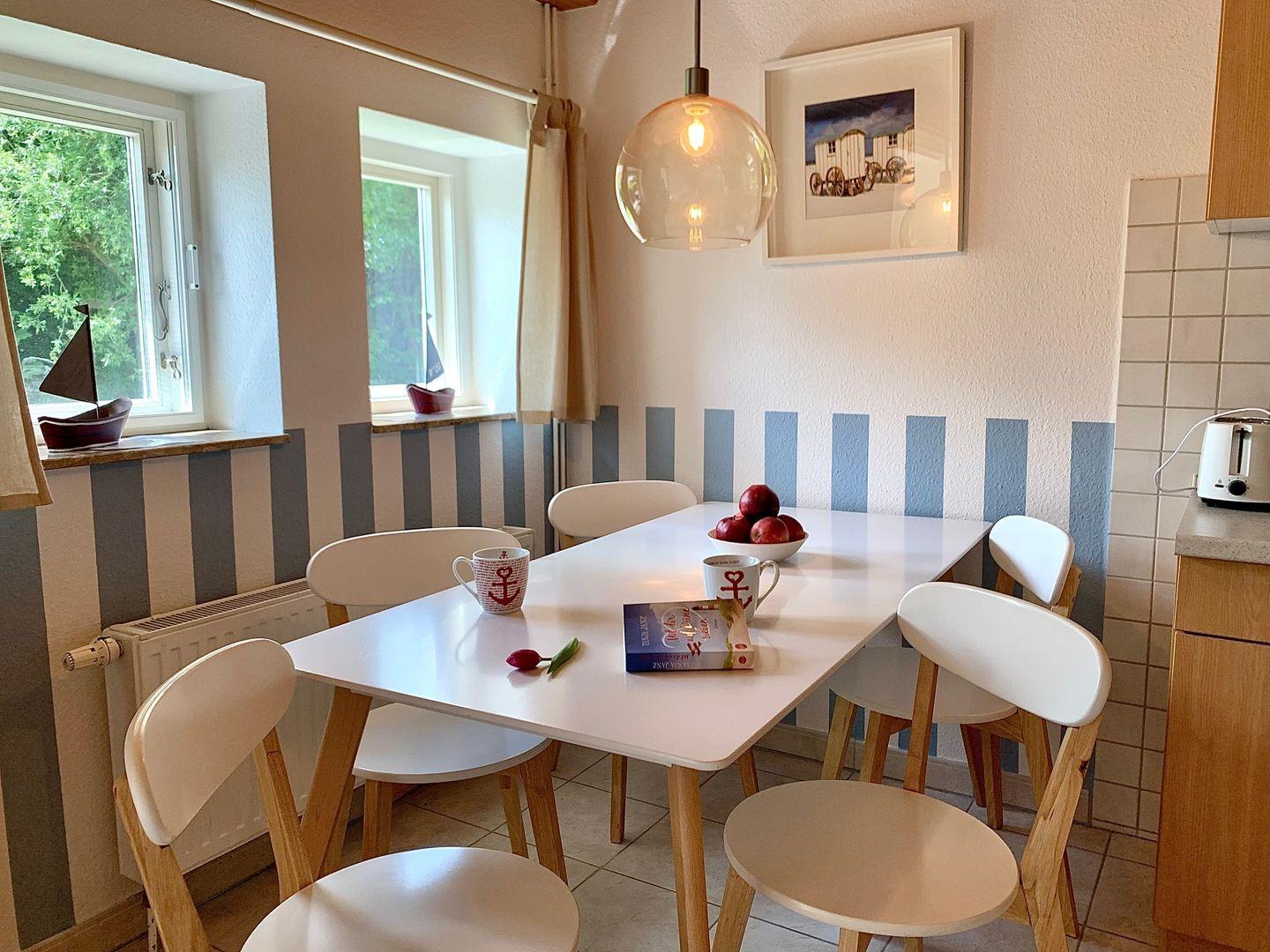 Das freundlich und maritim eingerichtete Wohnzimmer ist mit einer gemütlichen Couch sowie einem ansprechenden Essbereich ausgestattet.