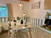 Das freundlich und maritim eingerichtete Wohnzimmer ist mit einer gemütlichen Couch sowie einem ansprechenden Essbereich ausgestattet.