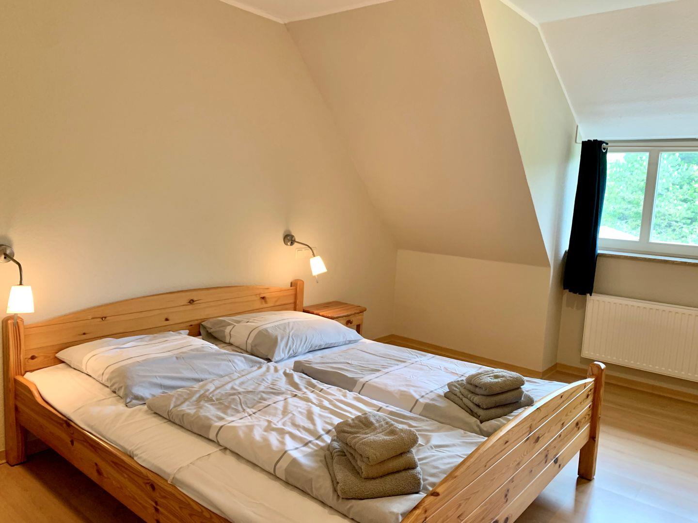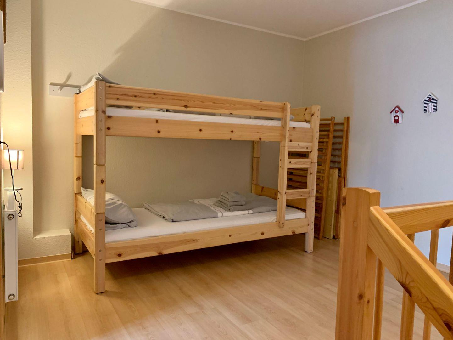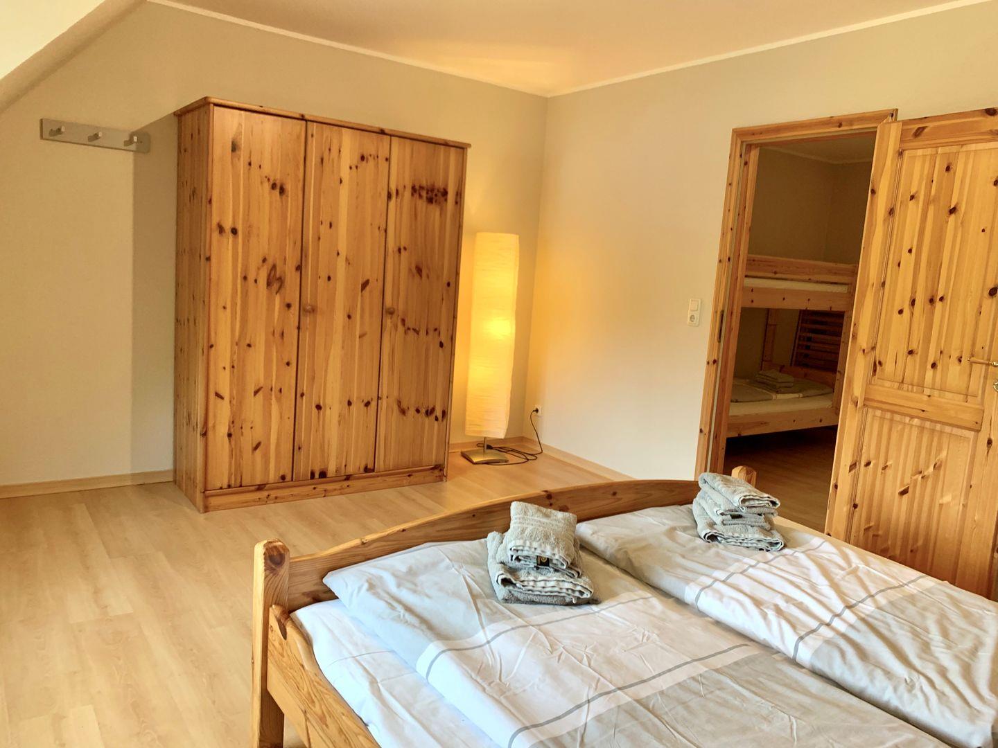 Im Obergeschoss befinden sich die beiden Schlafzimmer der Ferienwohnung. Ein Schlafzimmer ist mit komfortablem 180x200cm Doppelbett ausgestattet, auf der Galerie zum Flur steht ein Etagenbett zur Verfügung.
